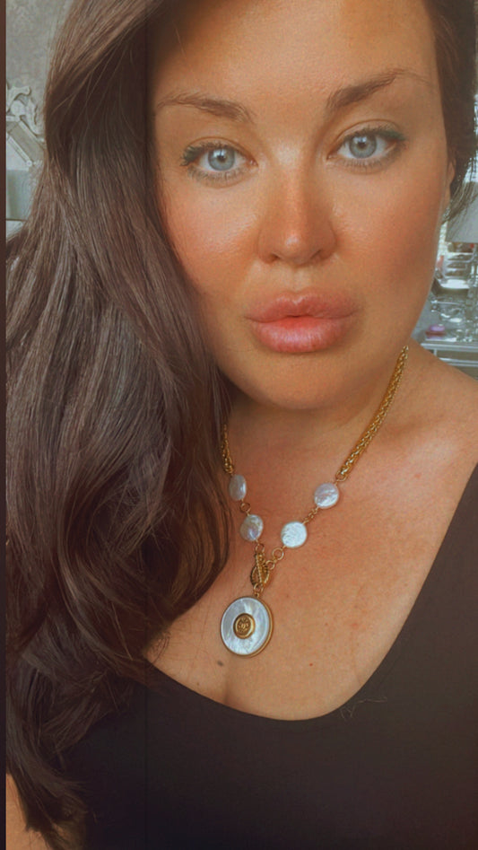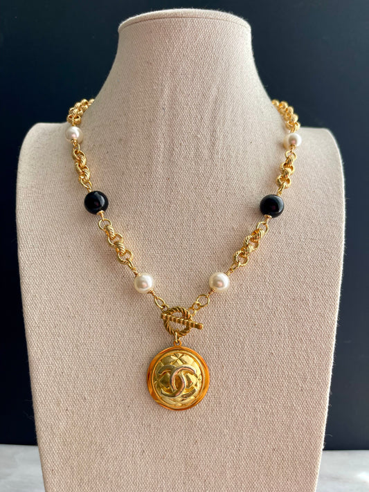 Huge One of a kind black and white pearls and Authentic Reworked button necklace