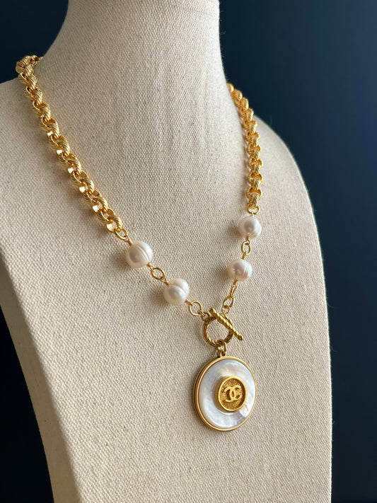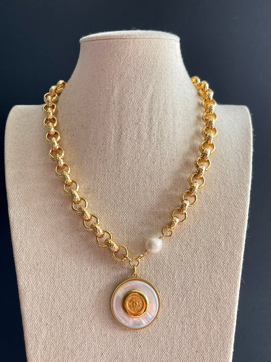 SUPER RARE Large MOTHER OF PEARL and Vintage Authentic reworked Gold button Necklace