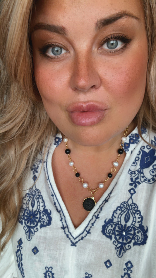 One of a kind black and white pearls and Authentic Reworked button necklace