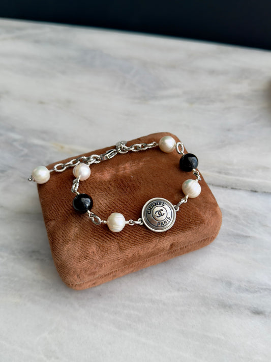 Silver small Authentic Reworked button bracelet with onyx and pearls 🖤
