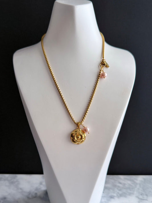 🌼 CAMELLIA 🌼 Extremely rare Vintage Authentic reworked Gold button Necklace with pink pearls - ONE OF A KIND