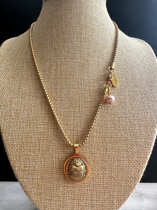 Vintage Authentic reworked Gold scarab beetle button Necklace
