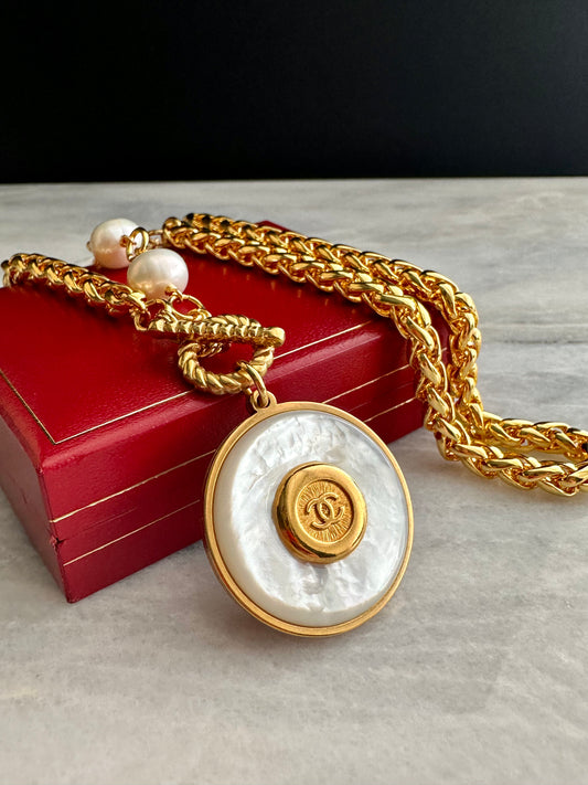 SUPER RARE Large MOTHER OF PEARL and Vintage Authentic reworked Gold button Necklace