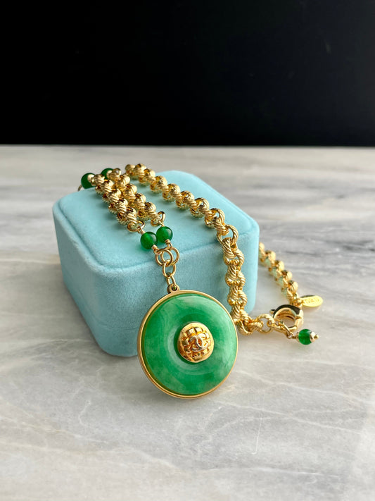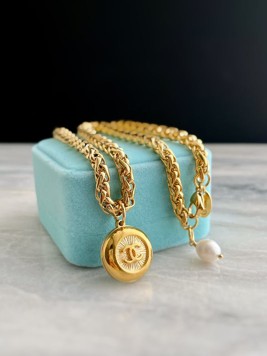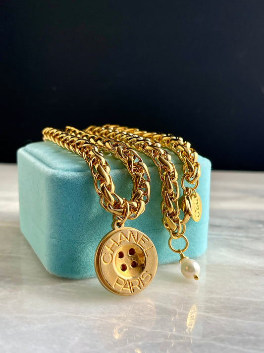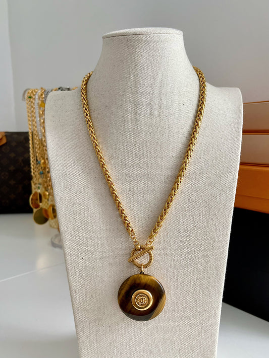 Large Black pendant Vintage Authentic reworked Gold button Necklace