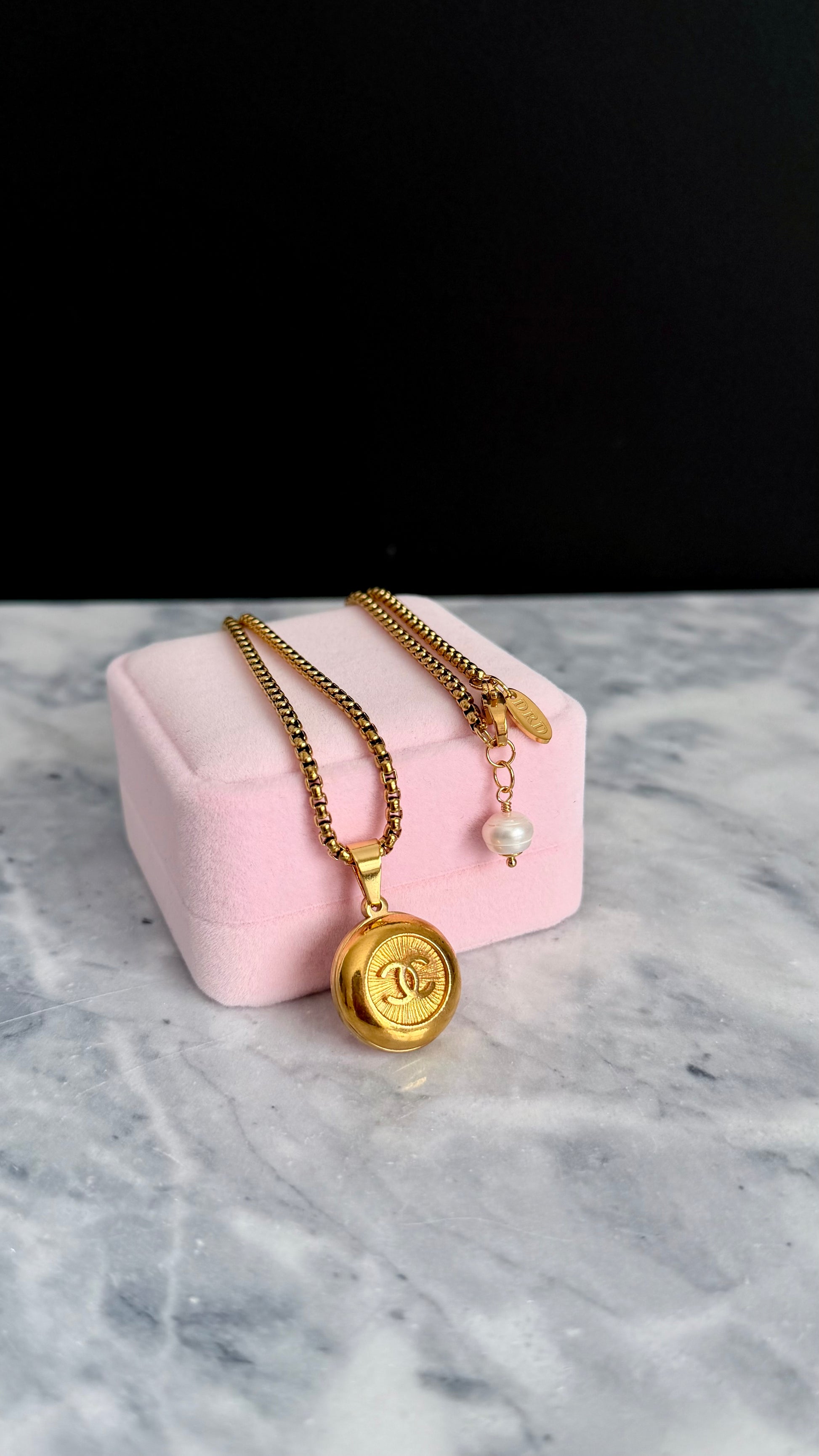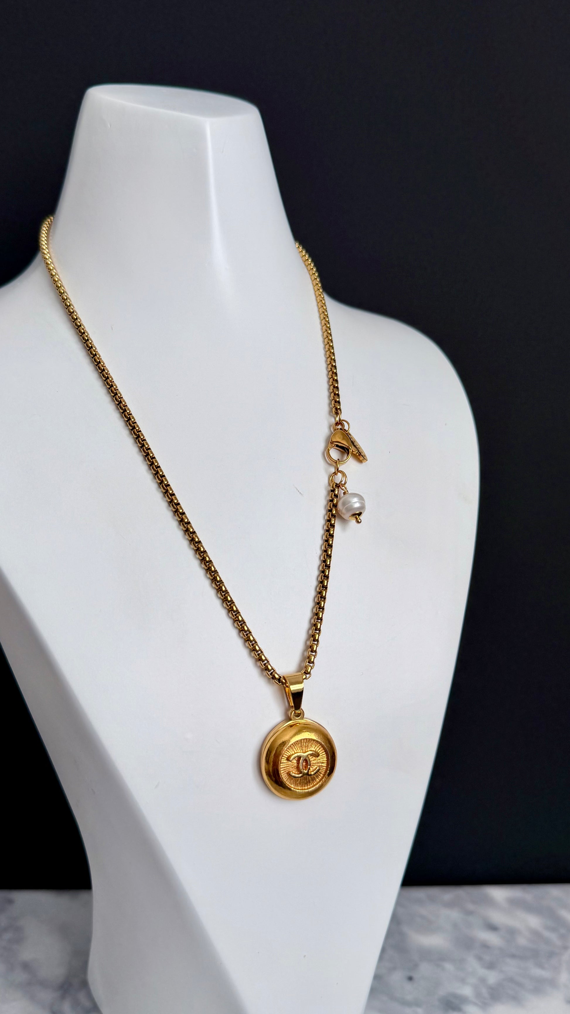 This STUNNING One of a Kind necklace is made using an Extremely Rare reworked vintage button in medium size in gold tone set onto a gold setting and hanging from a gorgeous round box chain and adorned with a genuine pearl that can be worn front or back.