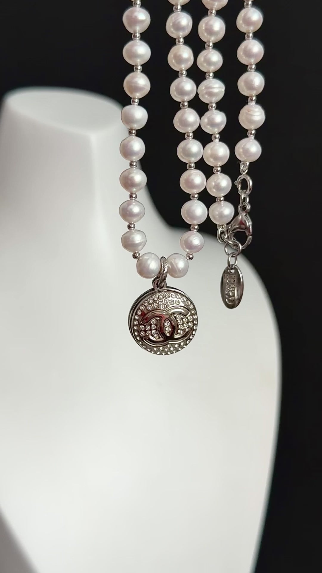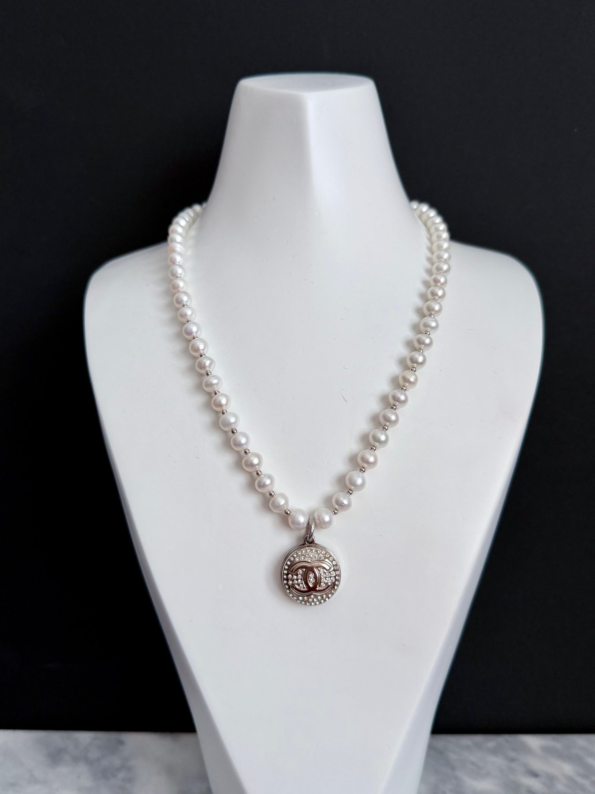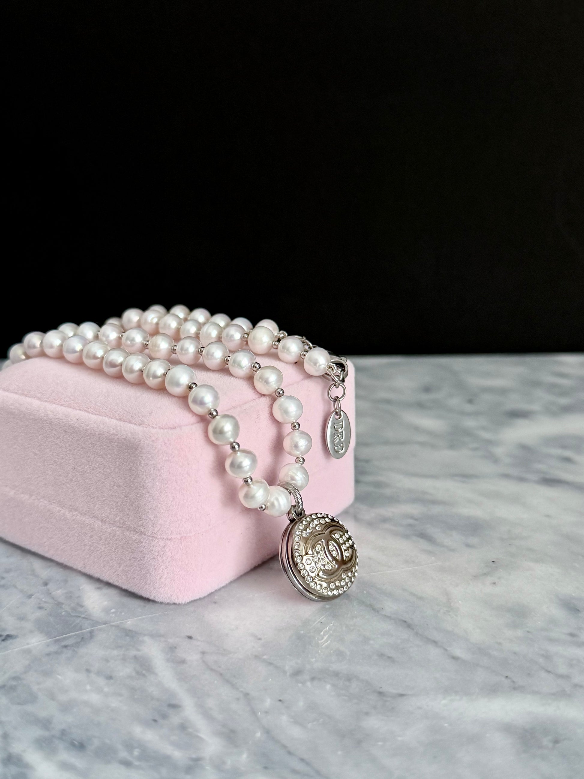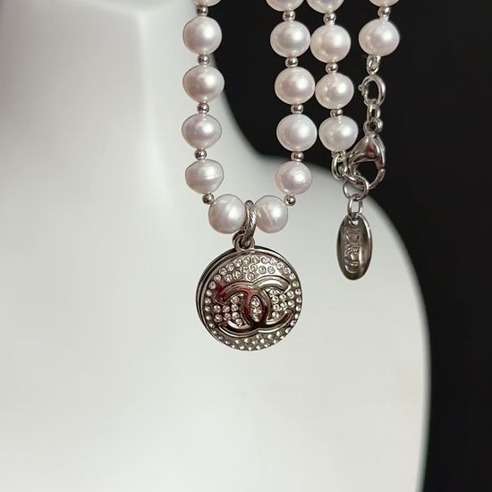 This magnificent pearl necklace is made using an Extremely Rare medium reworked C C button in bright silver design and crystals set onto a silver pendant, hanging from a genuine designer pearl necklace with sterling silver details.