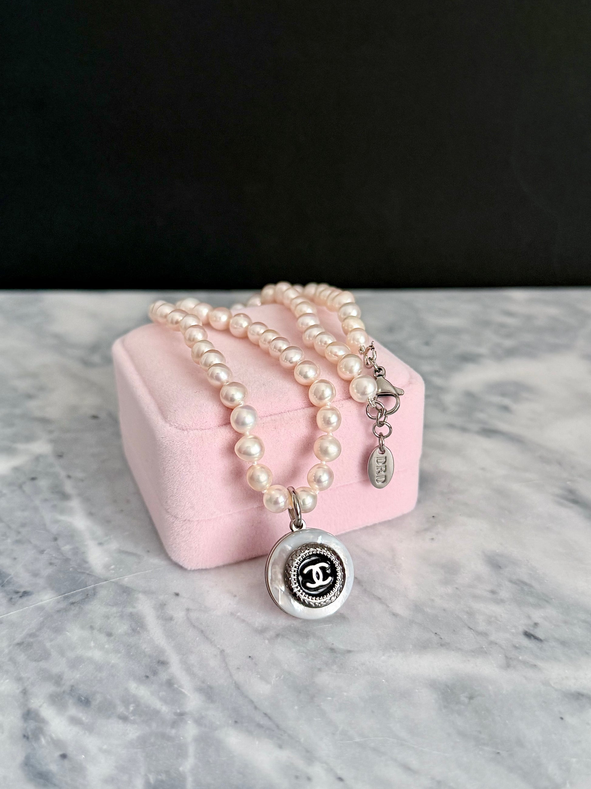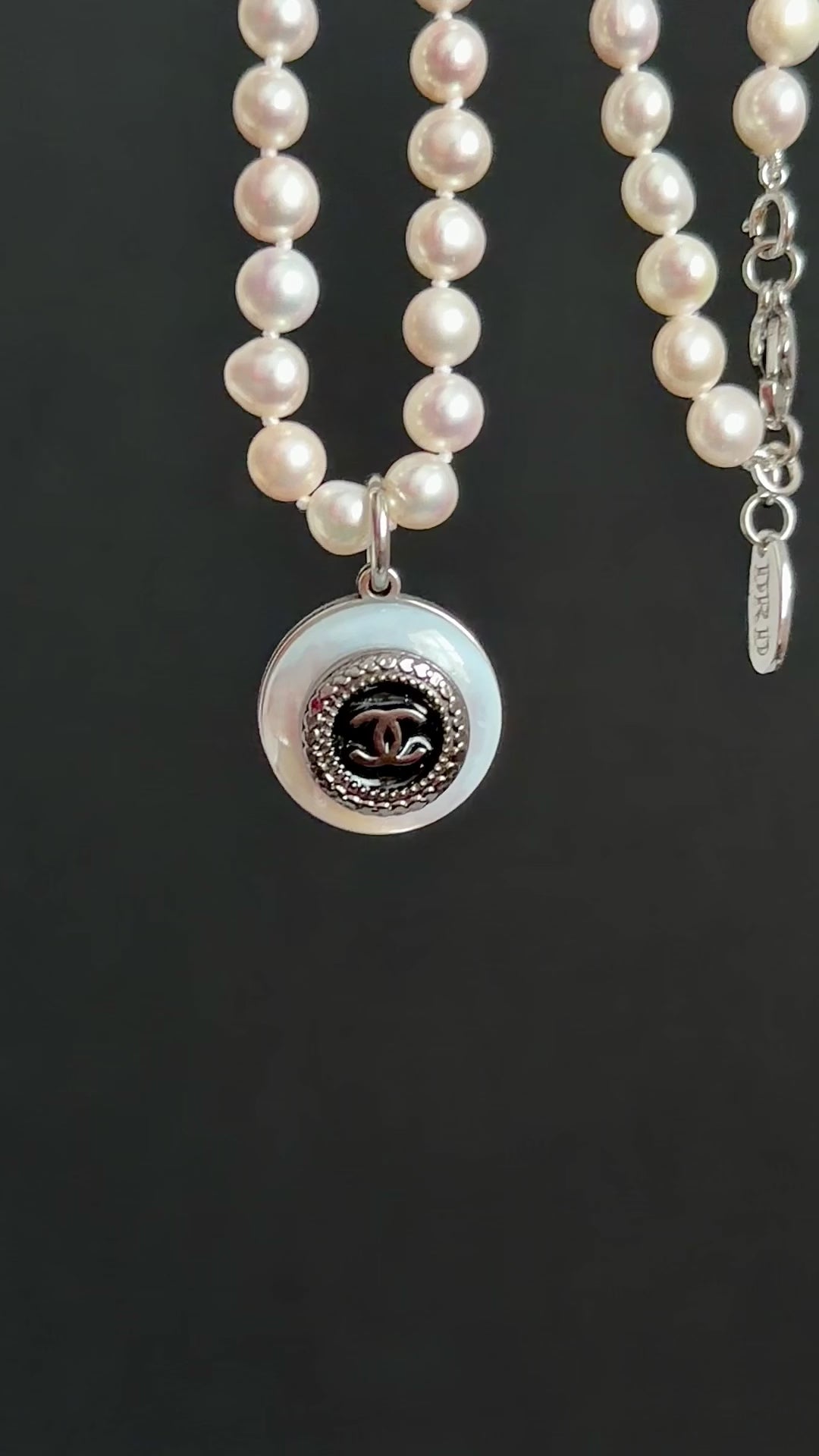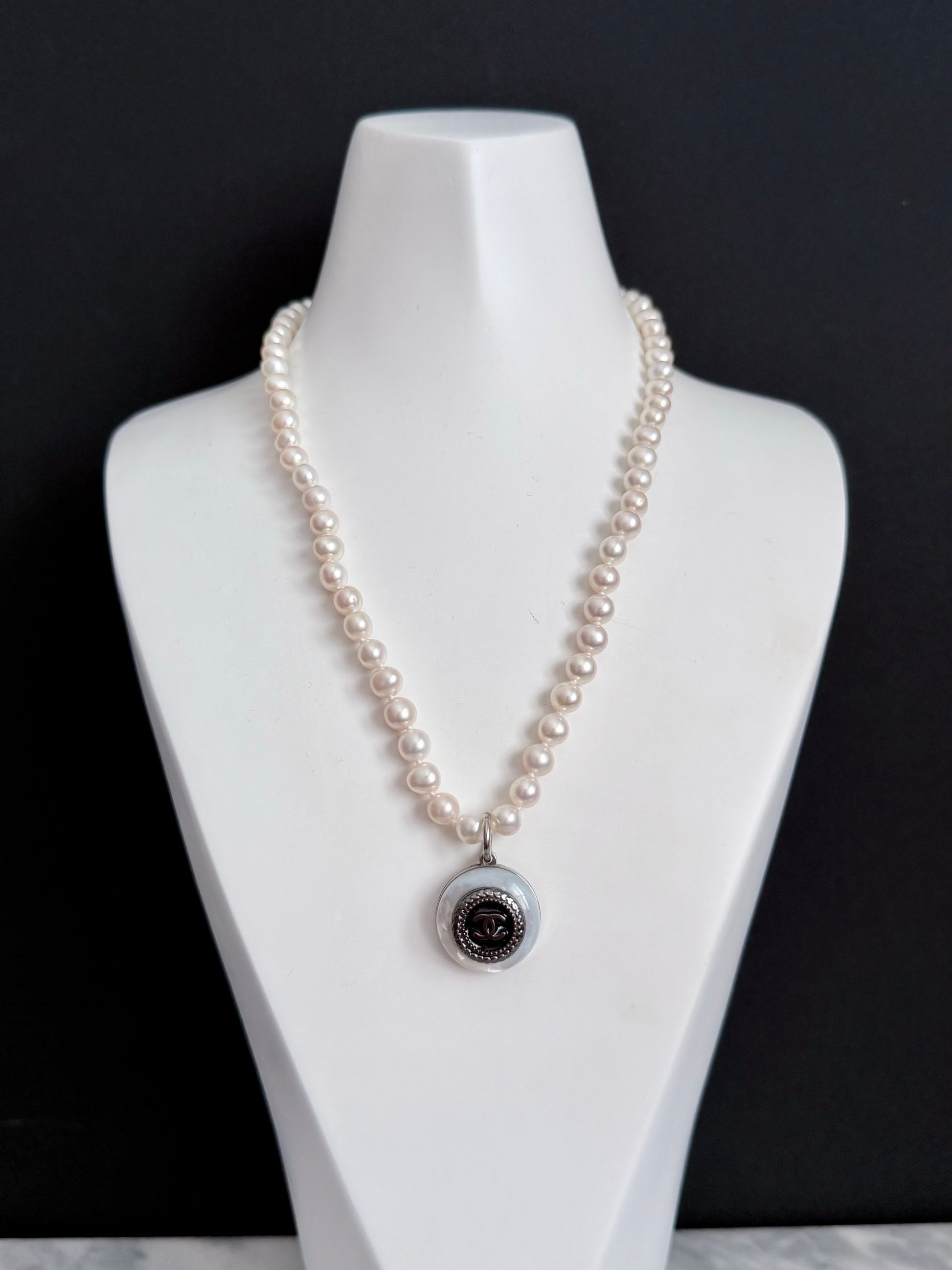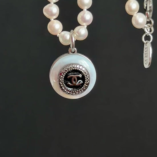 This magnificent pearl necklace is made using an Extremely Rare SMALL reworked C C button in black enamel design set onto a genuine mother of pearl pendant, hanging from a genuine designer pearl necklace.