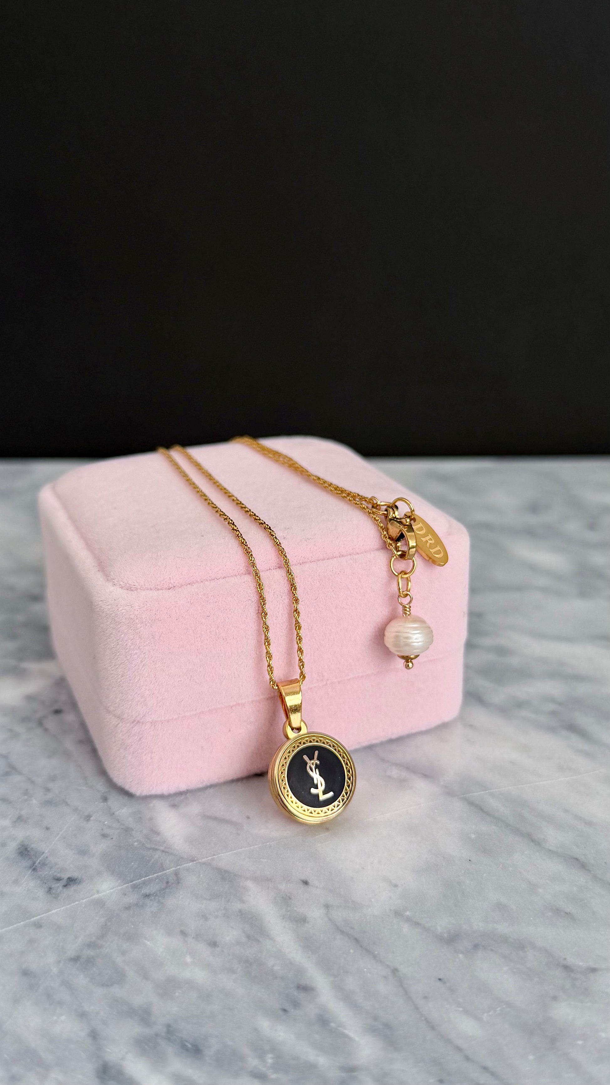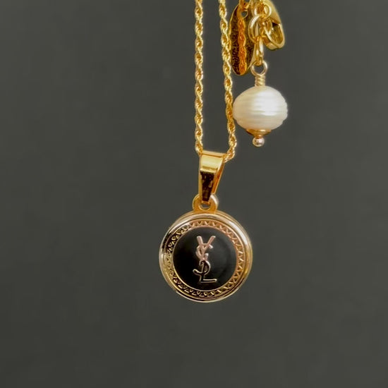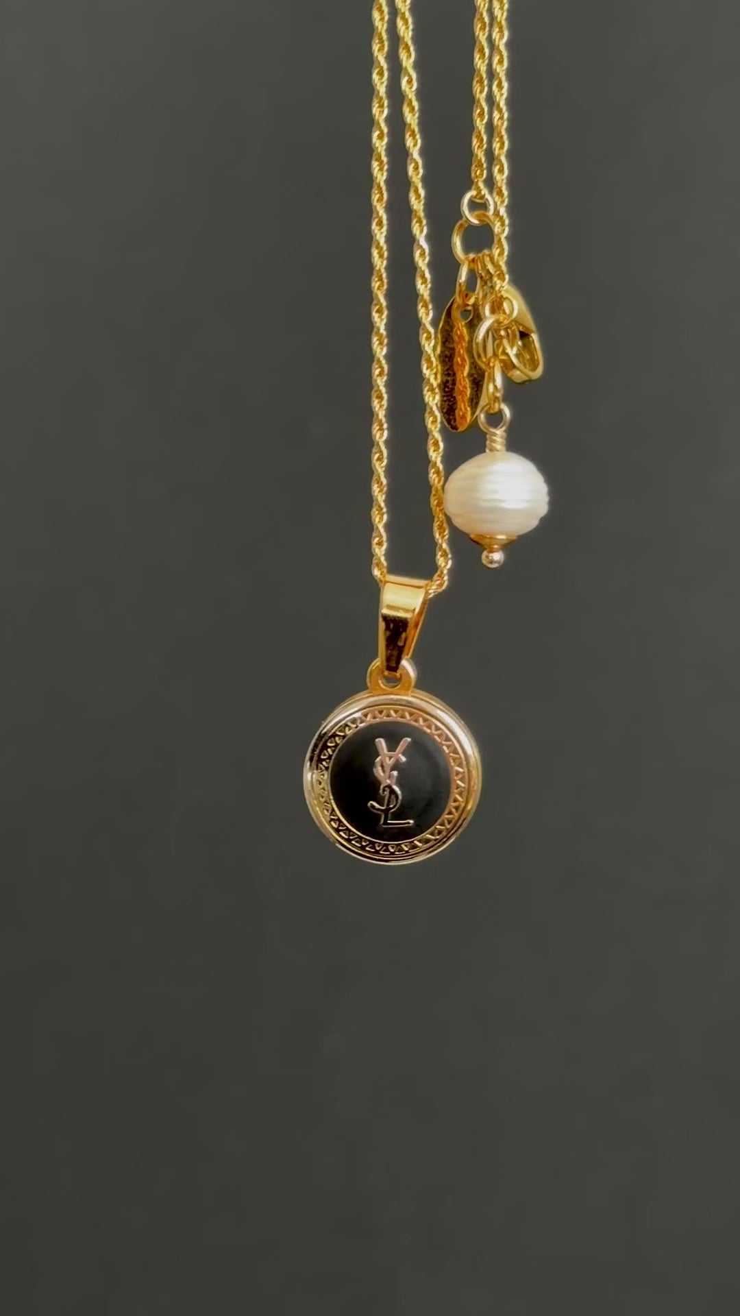 This delicate necklace is made using a reworked Vintage YSL button in small size in intricate gold border and matte black design, set onto a gold setting and hanging from a twisted rope chain. adorned with a genuine baroque pearl.