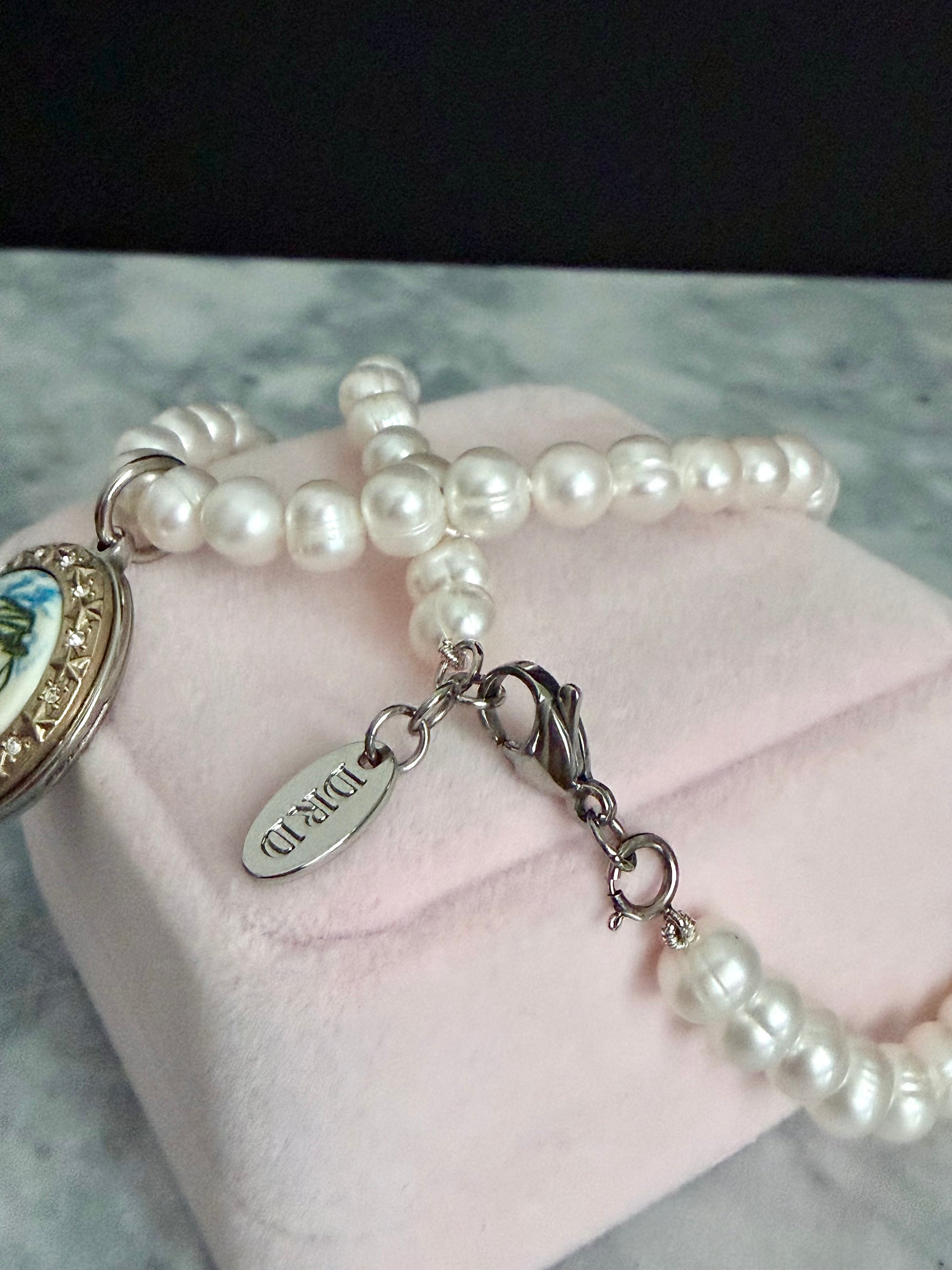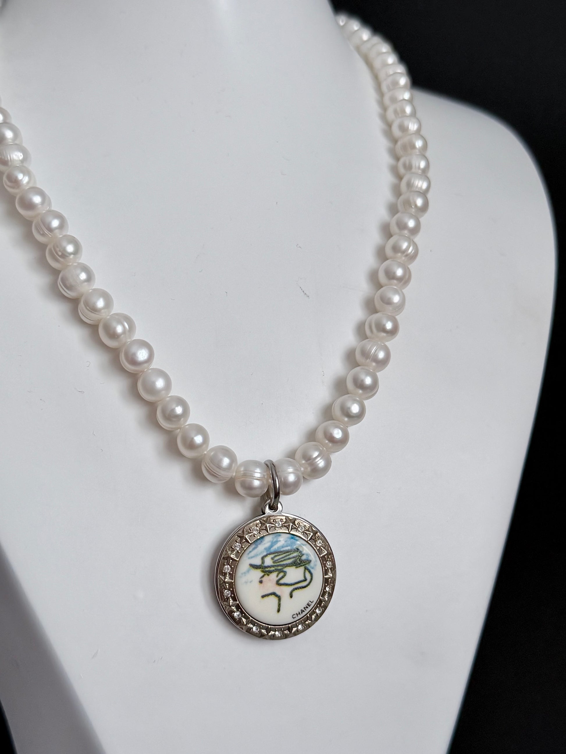 This unique necklace is made using an extremely rare large vintage reworked button in enamel painting like design in pale gold adorned with Swarovski crystals, set onto silver setting and hanging from an exquisite genuine Japanese cultivated pearl necklace.