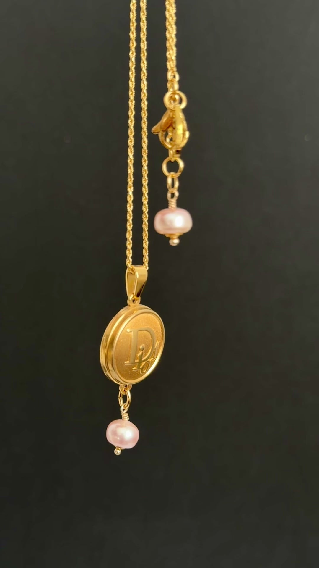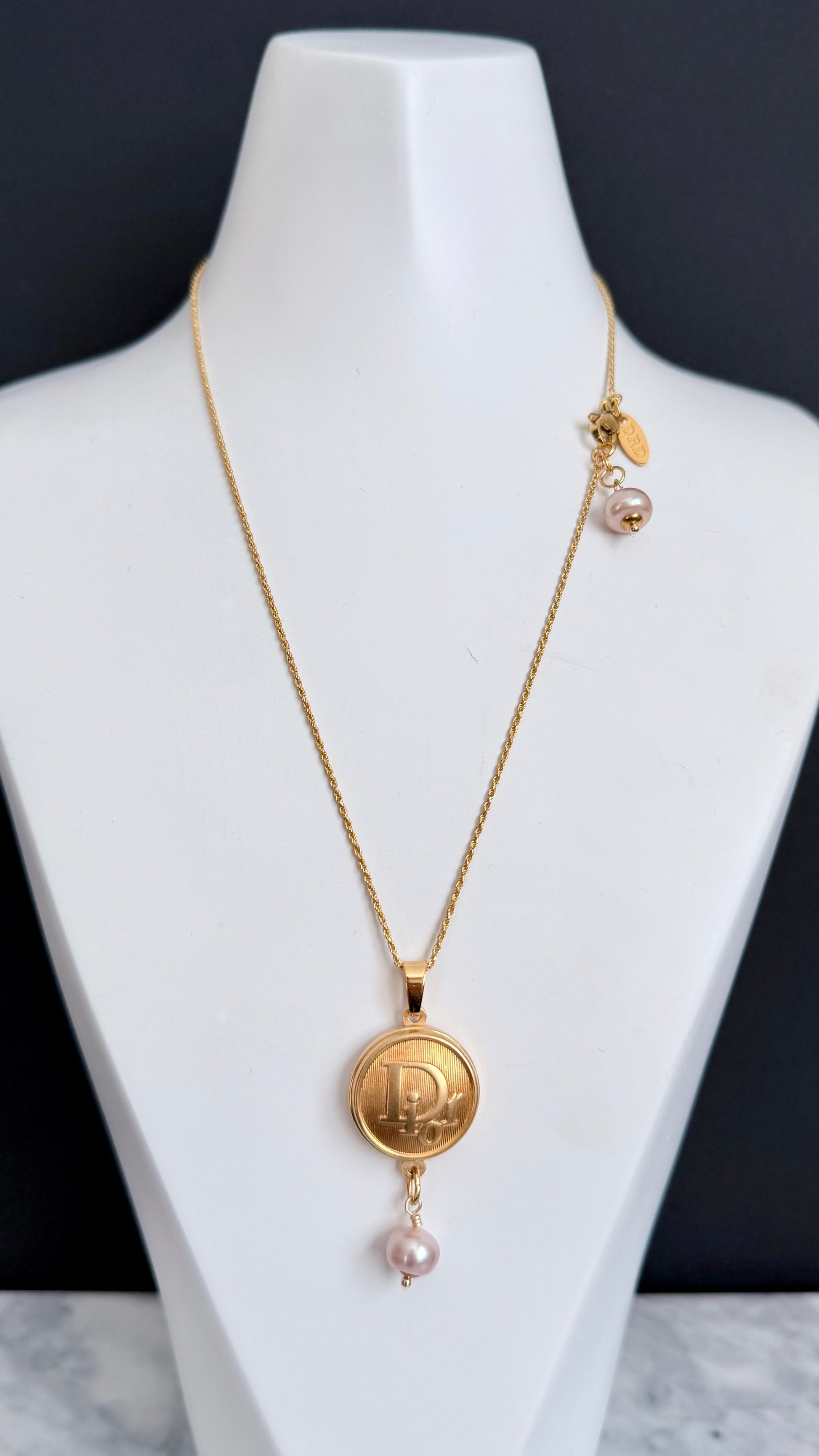 This gorgeous necklace is made using an EXTREMELY RARE reworked Vintage Dior button in medium size, set onto a mirror polished setting and hanging from a delicate rope chain, adorned with two beautiful genuine baroque pearls in pink tone.