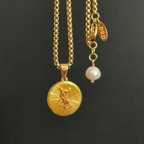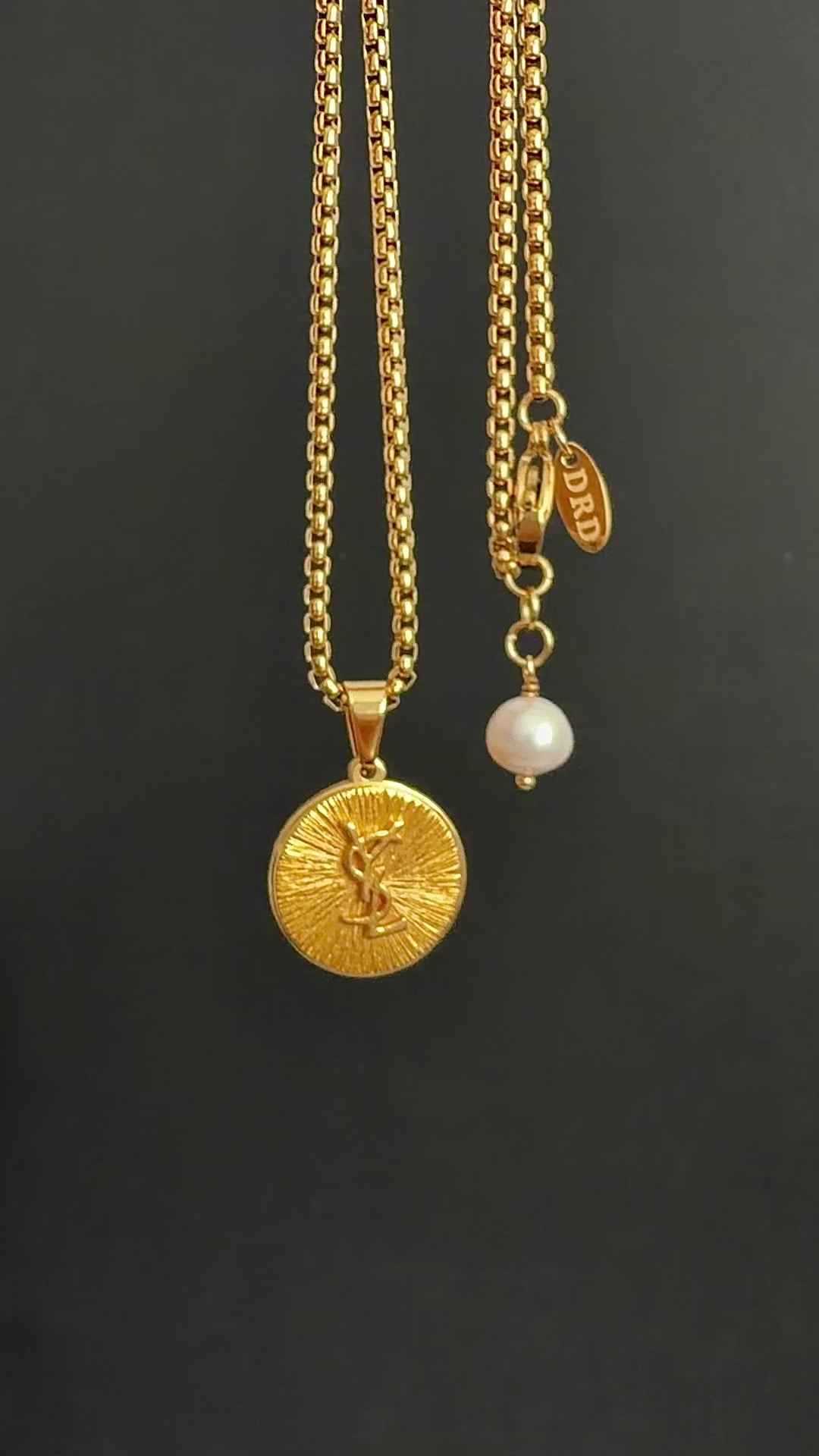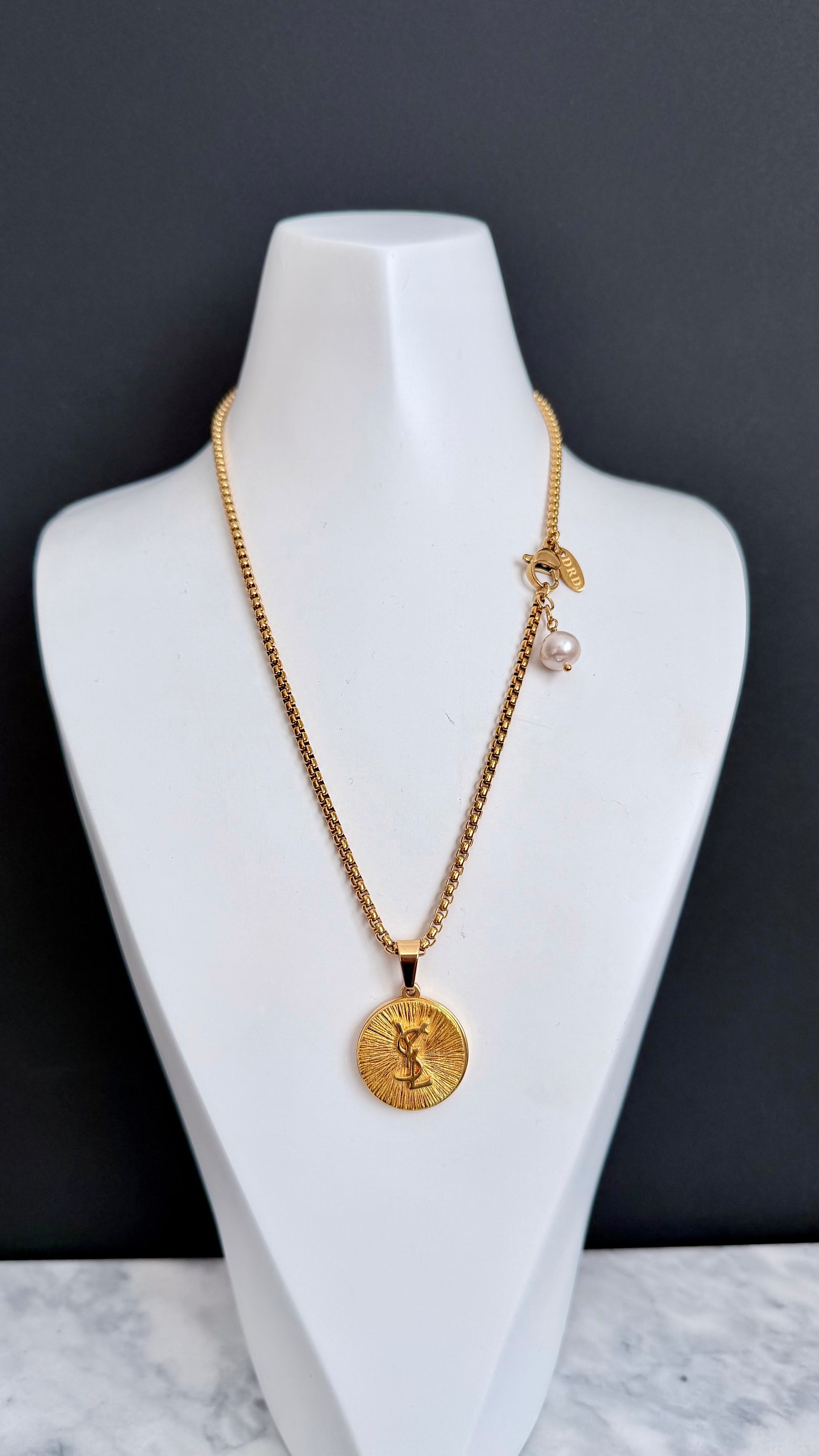 This magnificent extremely rare necklace is made using a reworked Vintage YSL button in medium size, set onto a mirror polished setting and hanging from a twisted rope chain. adorned with a genuine baroque pearl.