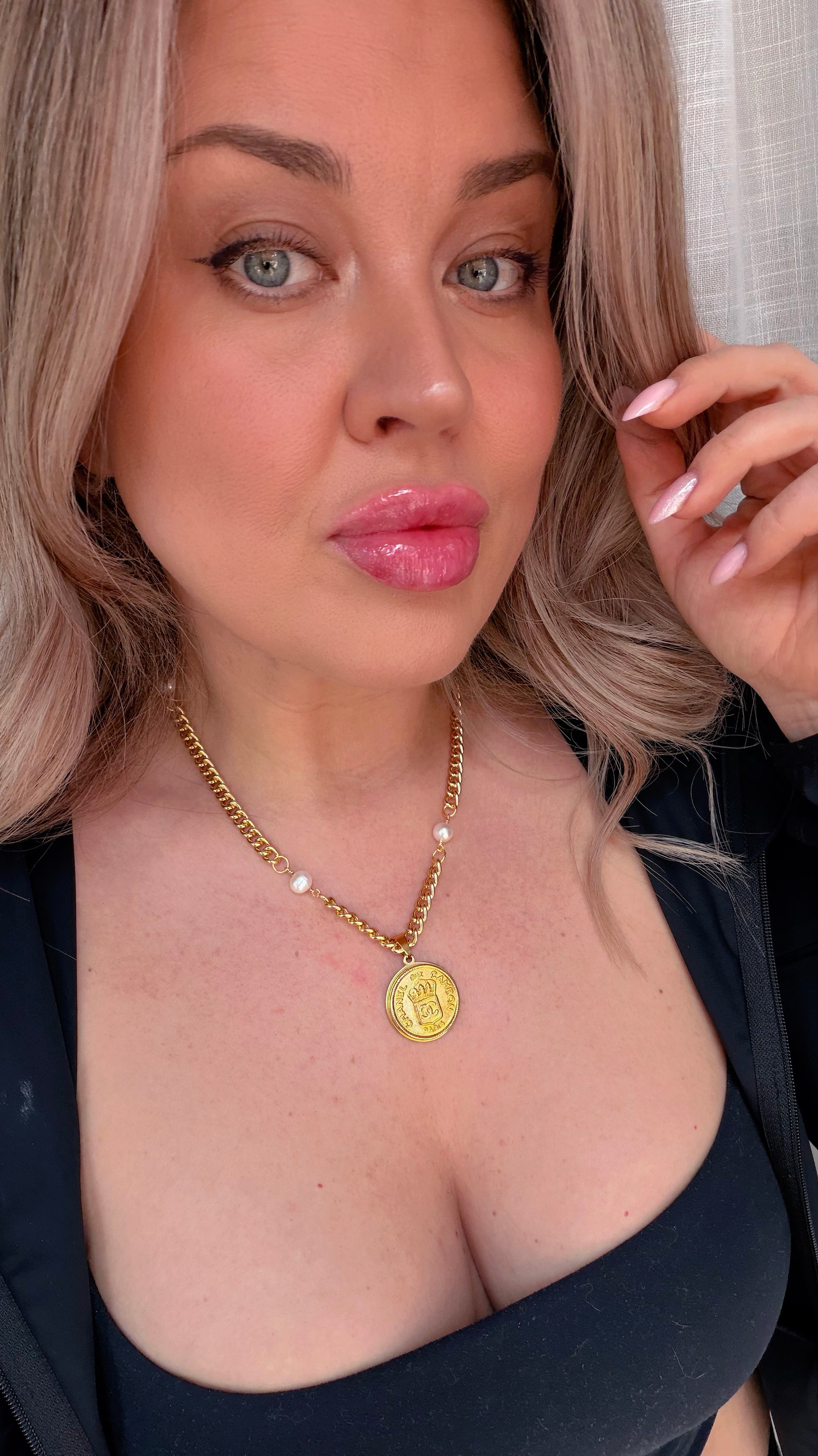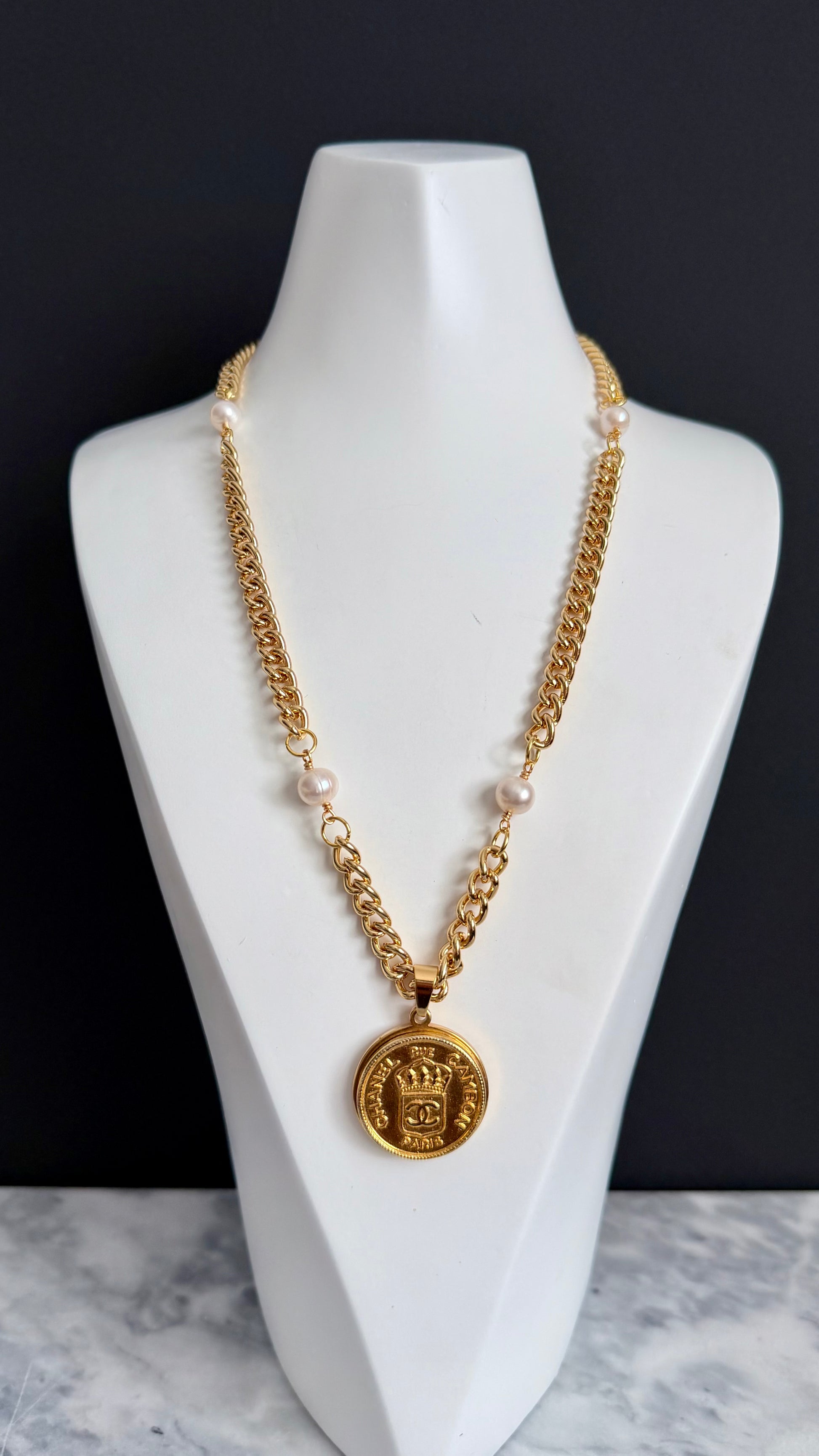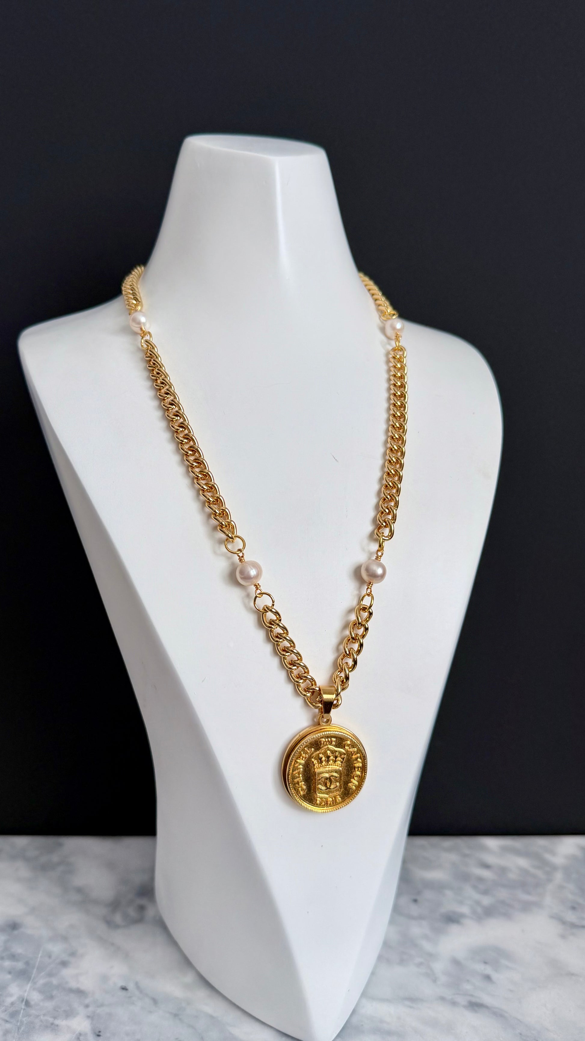 This STUNNING One of a Kind necklace is made using an Extremely Rare reworked vintage button in large size in gold tone set onto a gold setting and hanging from a gorgeous chunky necklace made up with genuine baroque pearls and a chunky round curb chain.