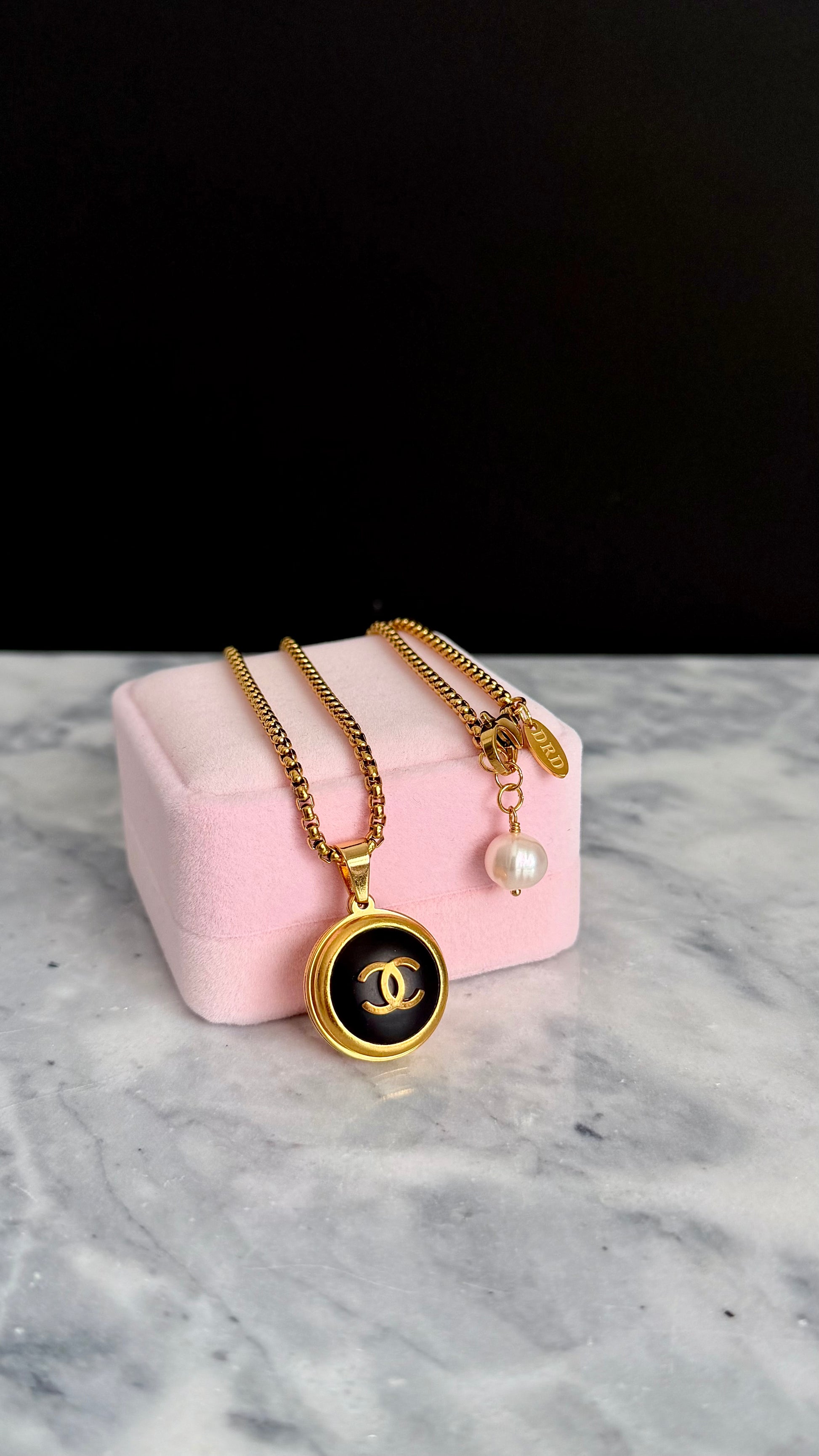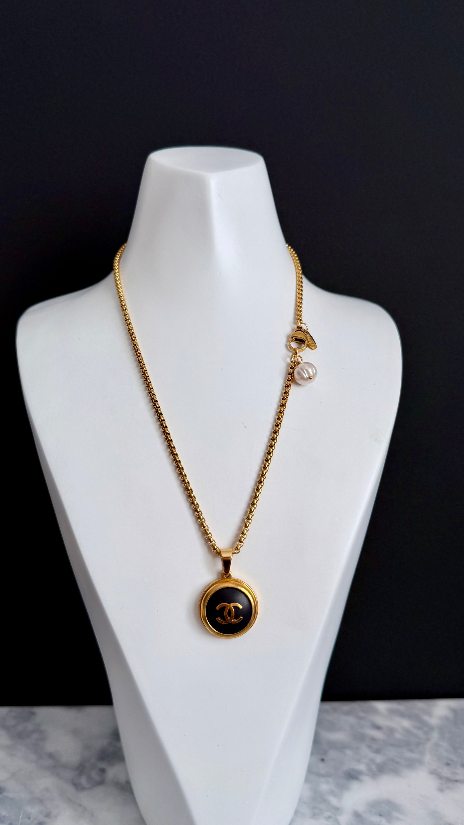 This gorgeous pendant necklace is made using an extremely rare Vintage reworked Authentic black and gold C C button in medium/large size in 3D design, set onto a gold polished setting and hanging from a gorgeous gold round box chain, adorned with a genuine baroque pearl that can be worn front or back.