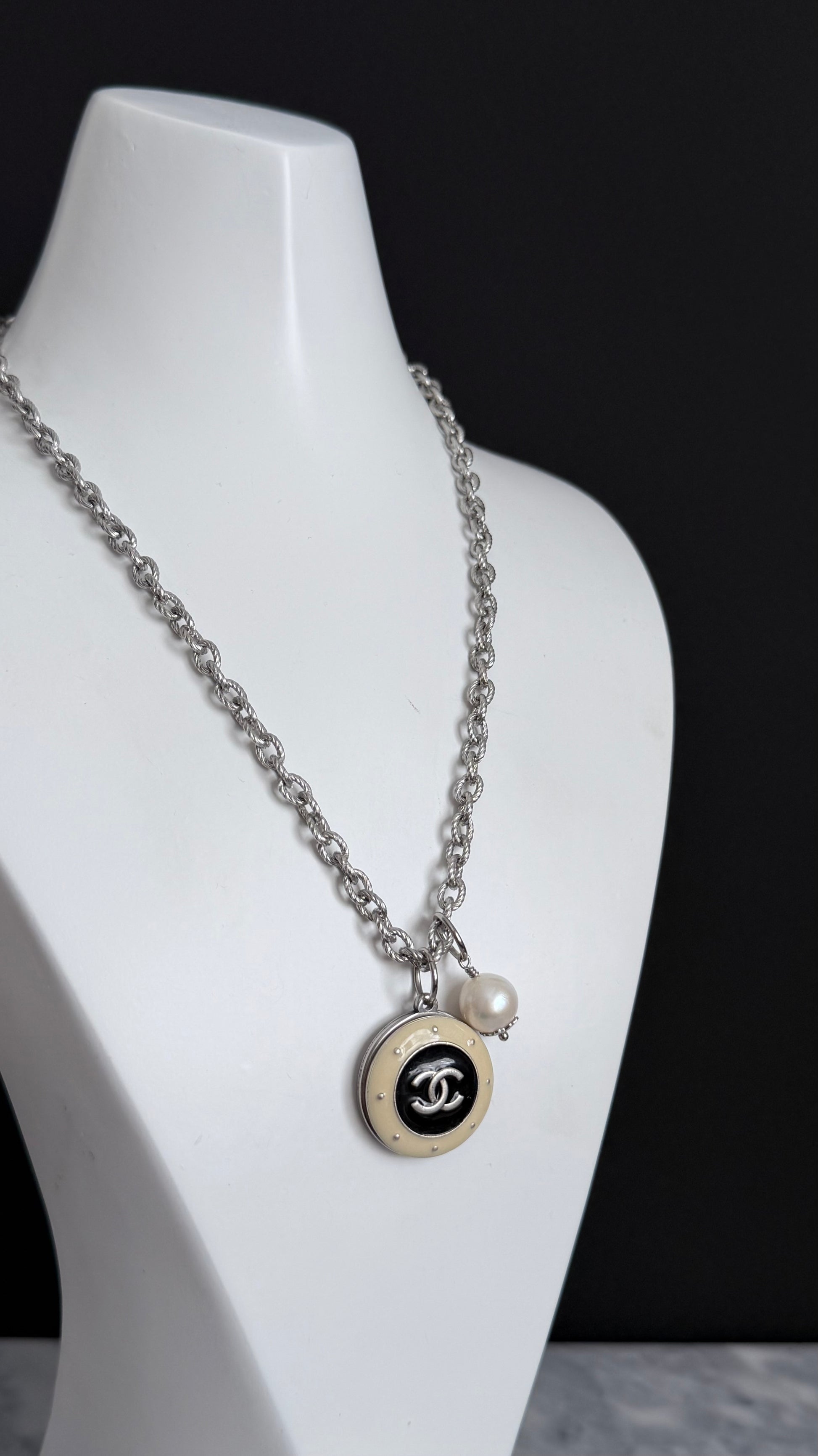 This gorgeous chunky necklace is made using an extremely rare Modern reworked C C button in large size in cream and black enamelled design, set onto a silver setting and hanging from an intricate cut link chain and adorned with a genuine pearl charm that can be worn front or back.