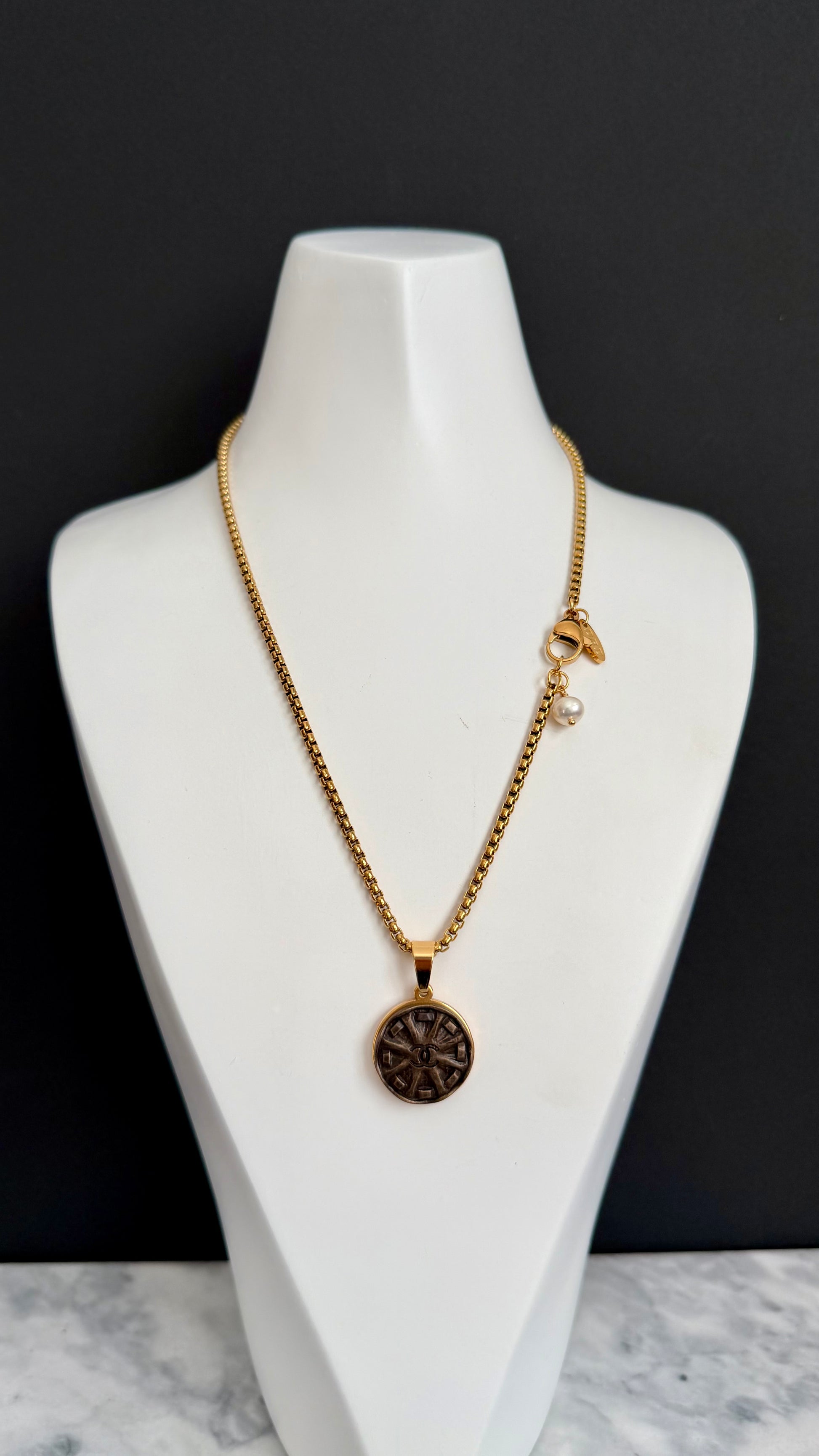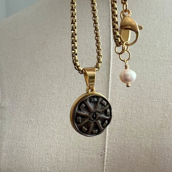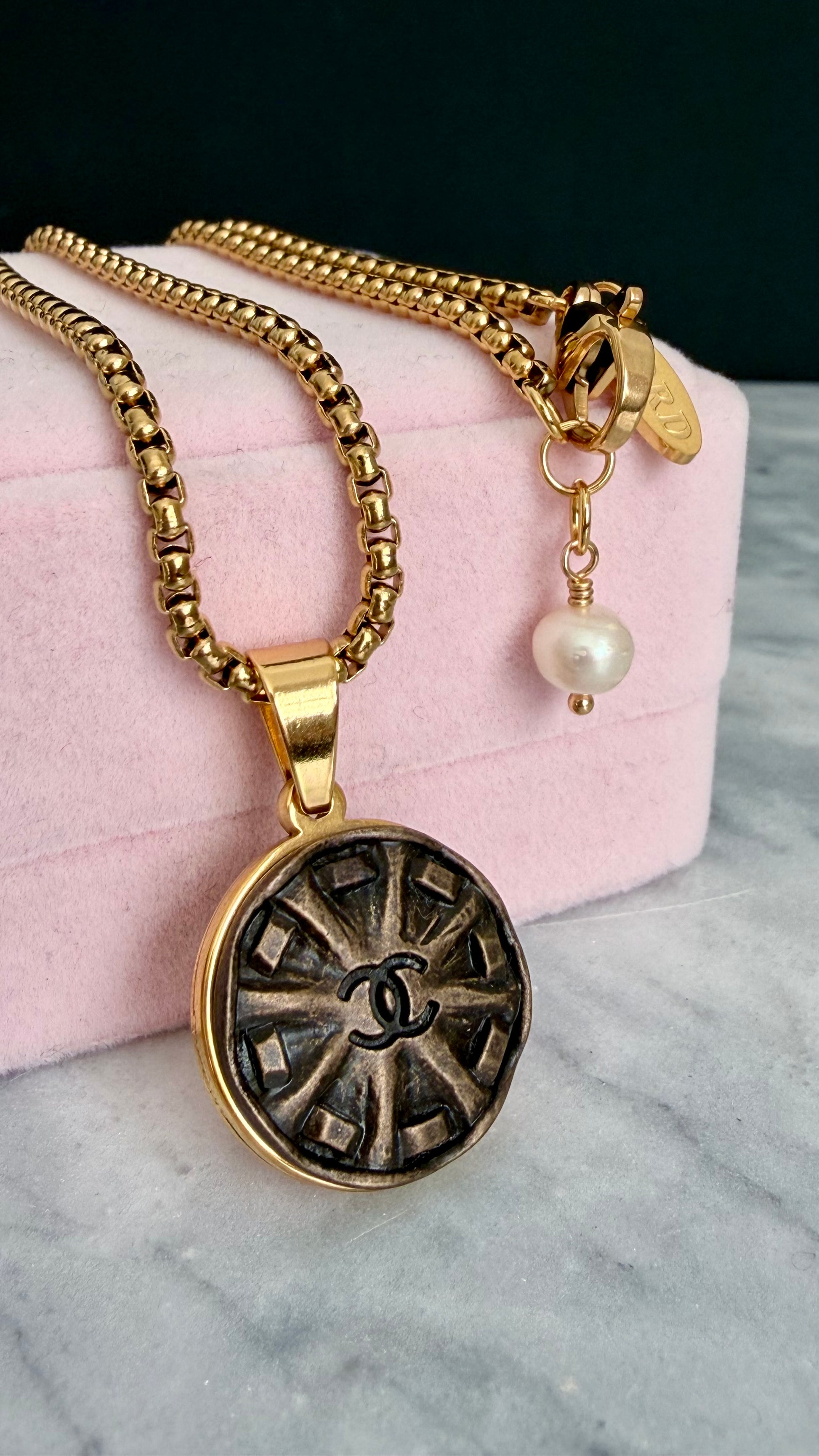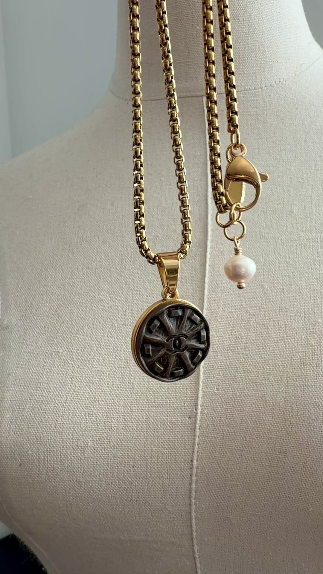 This gorgeous necklace is made using an extremely rare reworked Vintage button in medium size and Antique gold design, set onto a mirror polished setting and hanging from a round box chain. Adorned with a beautiful genuine baroque pearl.
