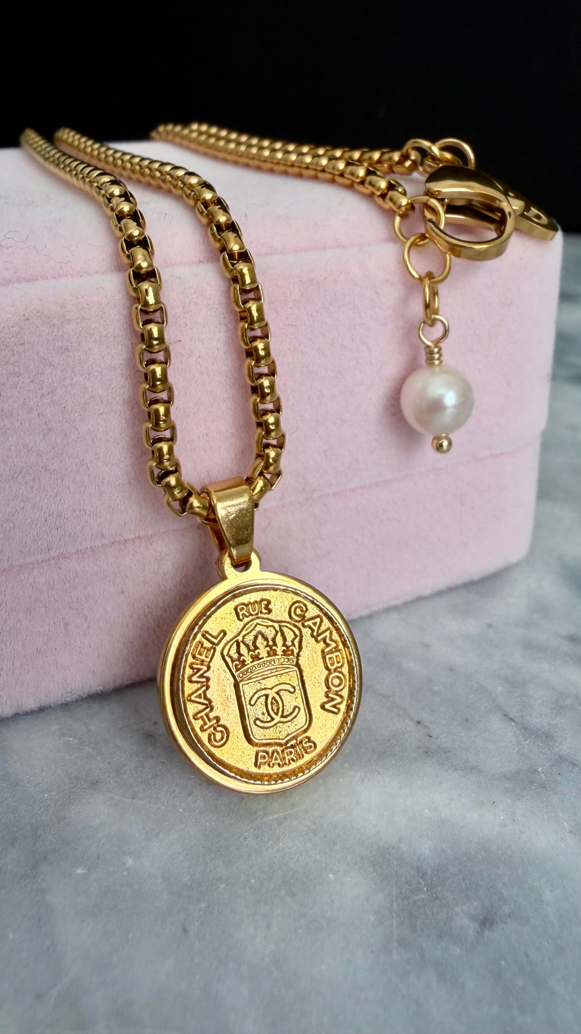 This STUNNING One of a Kind necklace is made using an Extremely Rare reworked vintage button in SMALL size in gold tone and intricate Crown design, set onto a gold setting and hanging from a gorgeous round box chain and adorned with a genuine pearl that can be worn front or back.
