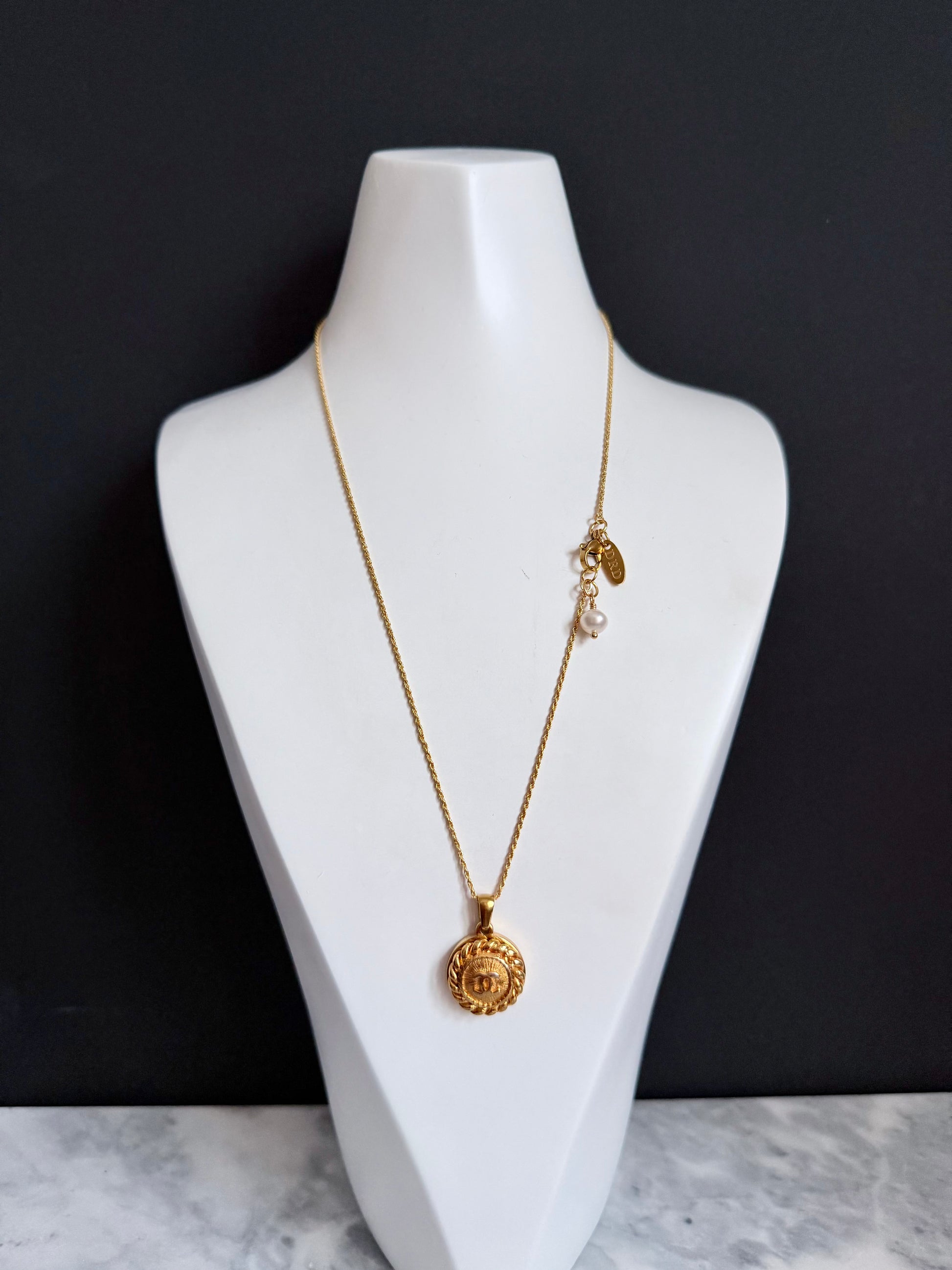 This gorgeous delicate necklace is made using an EXTREMELY RARE reworked Vintage C C button in small size, set onto a mirror polished setting and hanging from a delicate rope chain, adorned with a beautiful genuine baroque pearl.