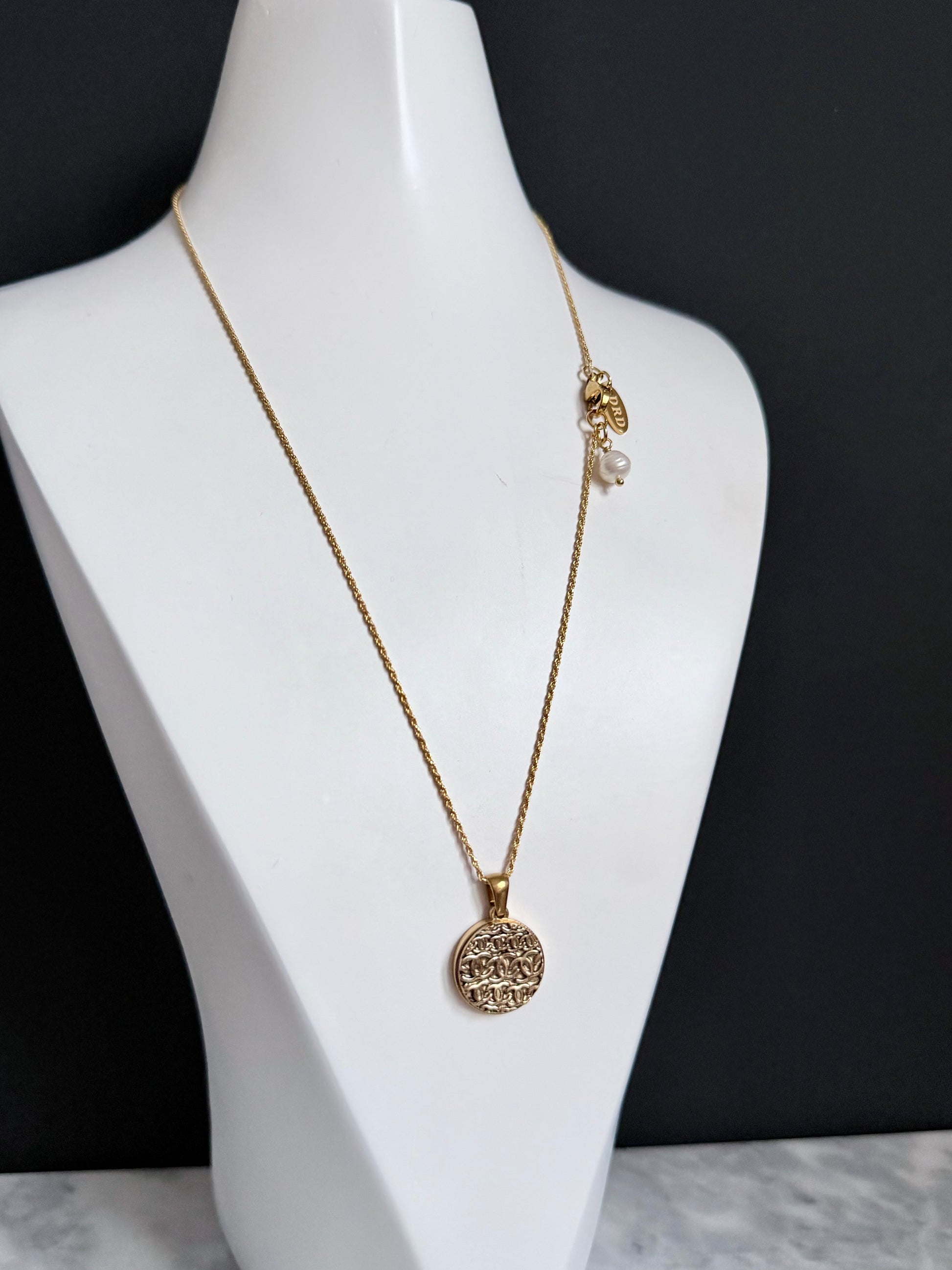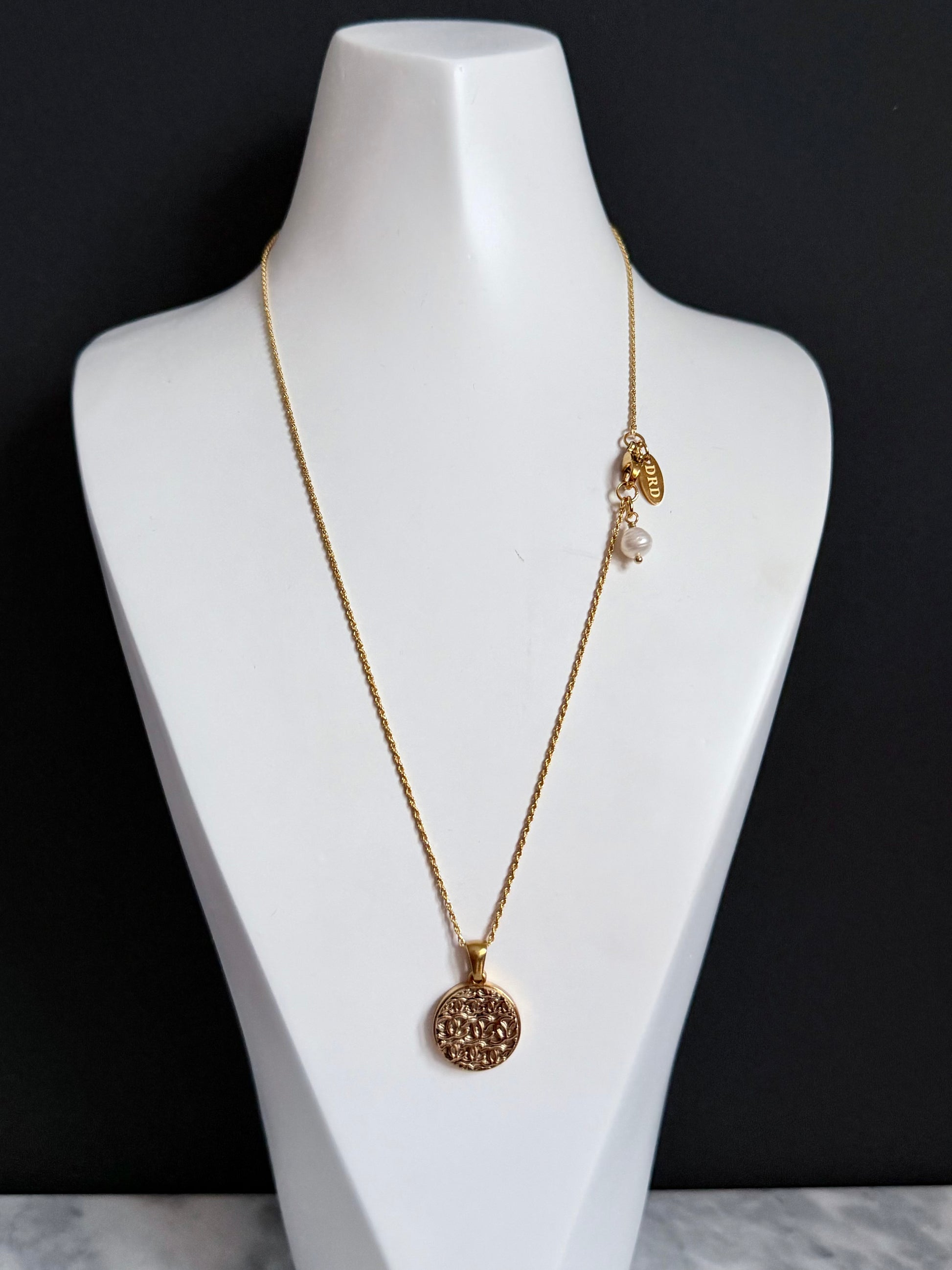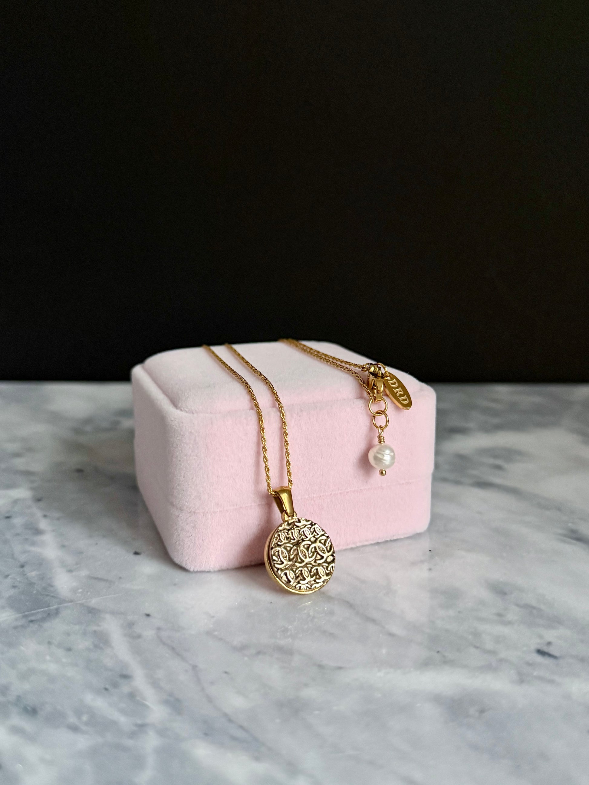 This gorgeous delicate necklace is made using an EXTREMELY RARE reworked Vintage C C button in small size in scattered gold C Cs all over design, set onto a gold setting and hanging from a delicate rope chain, adorned with a delicate genuine baroque pearl.