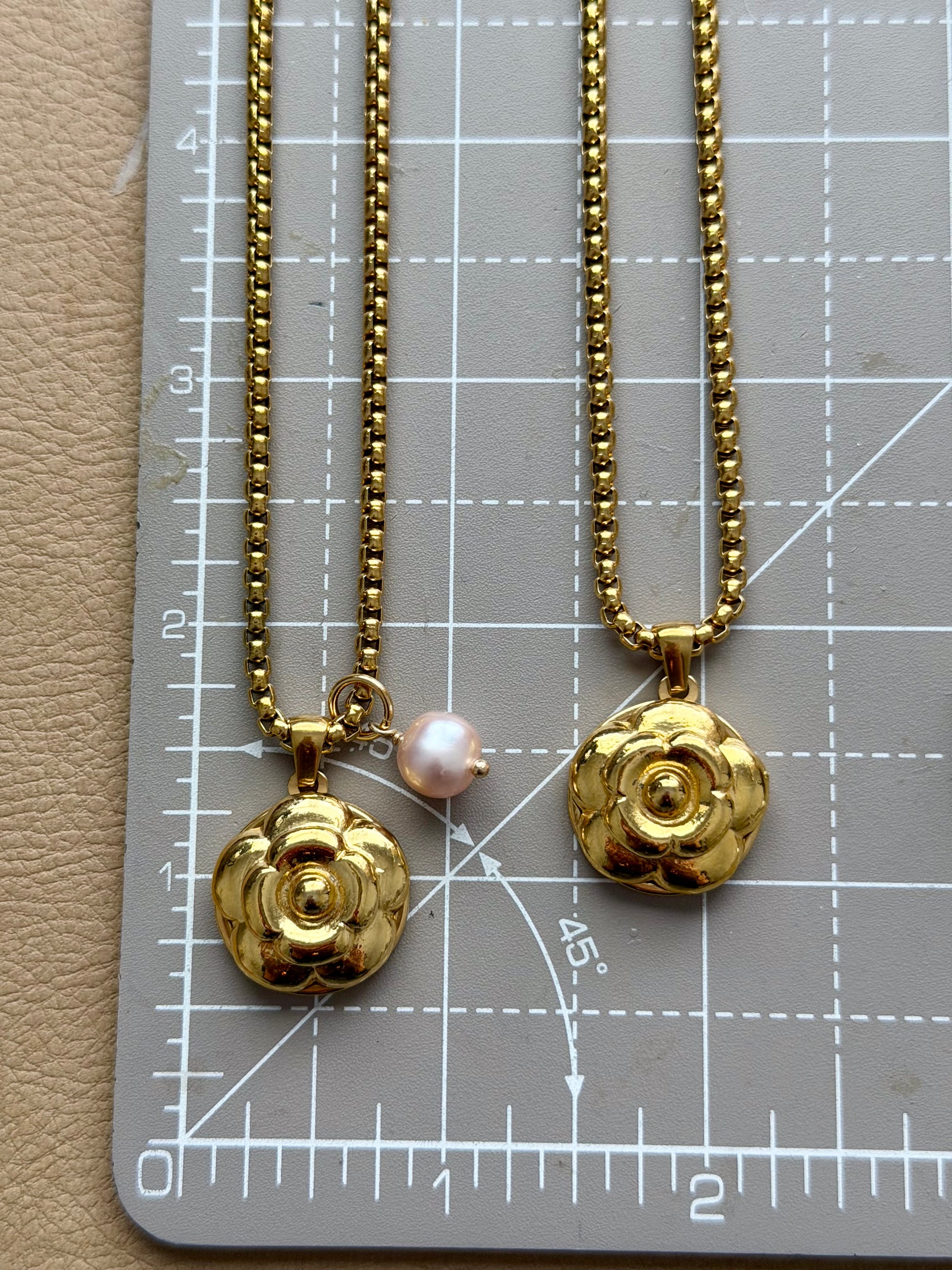 This magnificent pendant necklace is made using an incredibly rare reworked Vintage C C button in unique Camellia design- set onto a gold polished setting and hanging from a round box chain in gold tone.