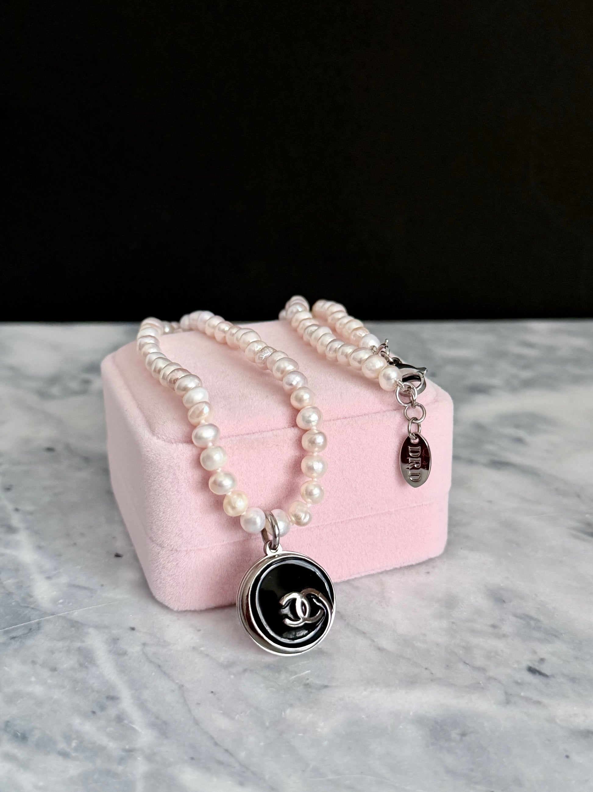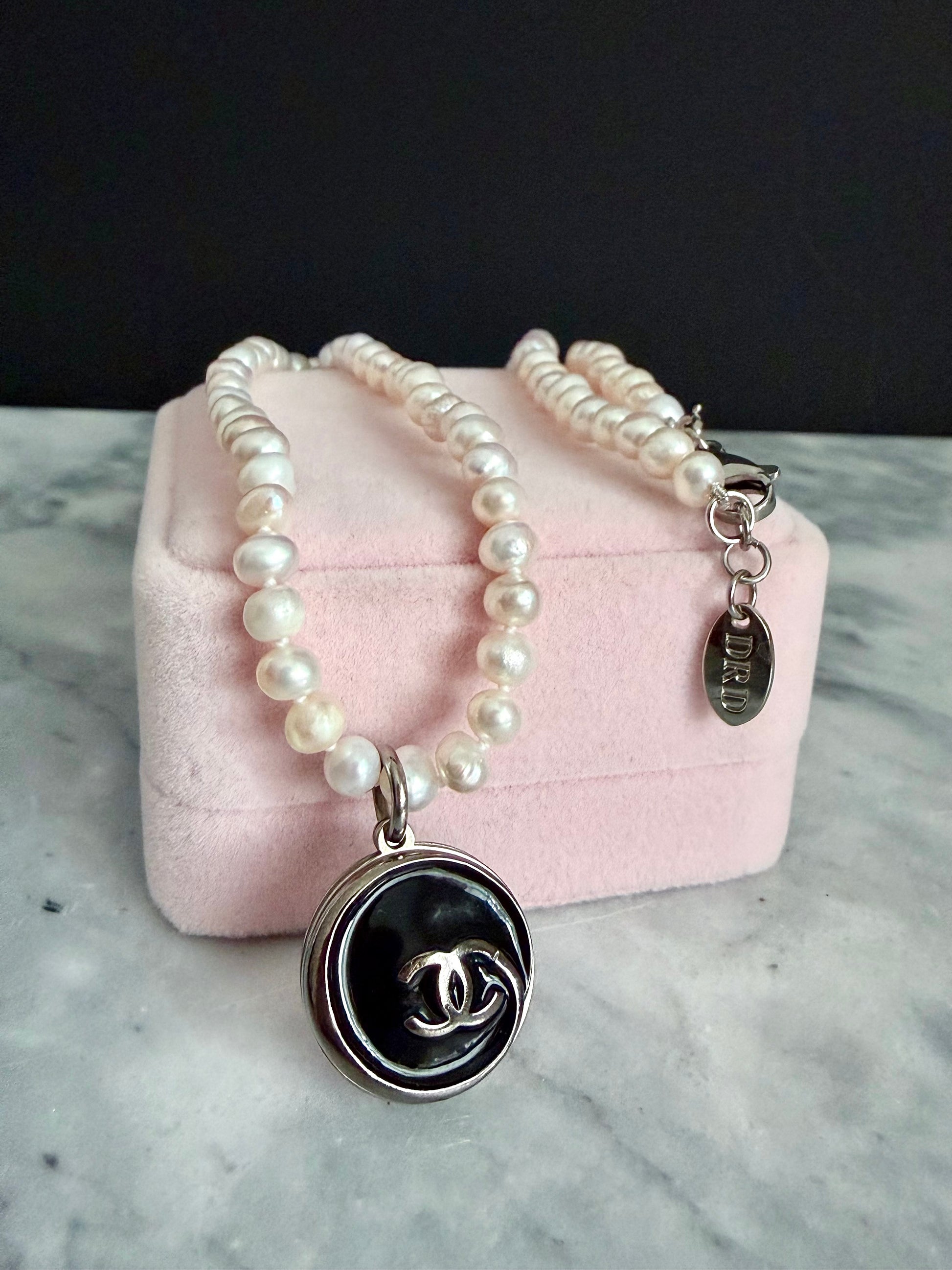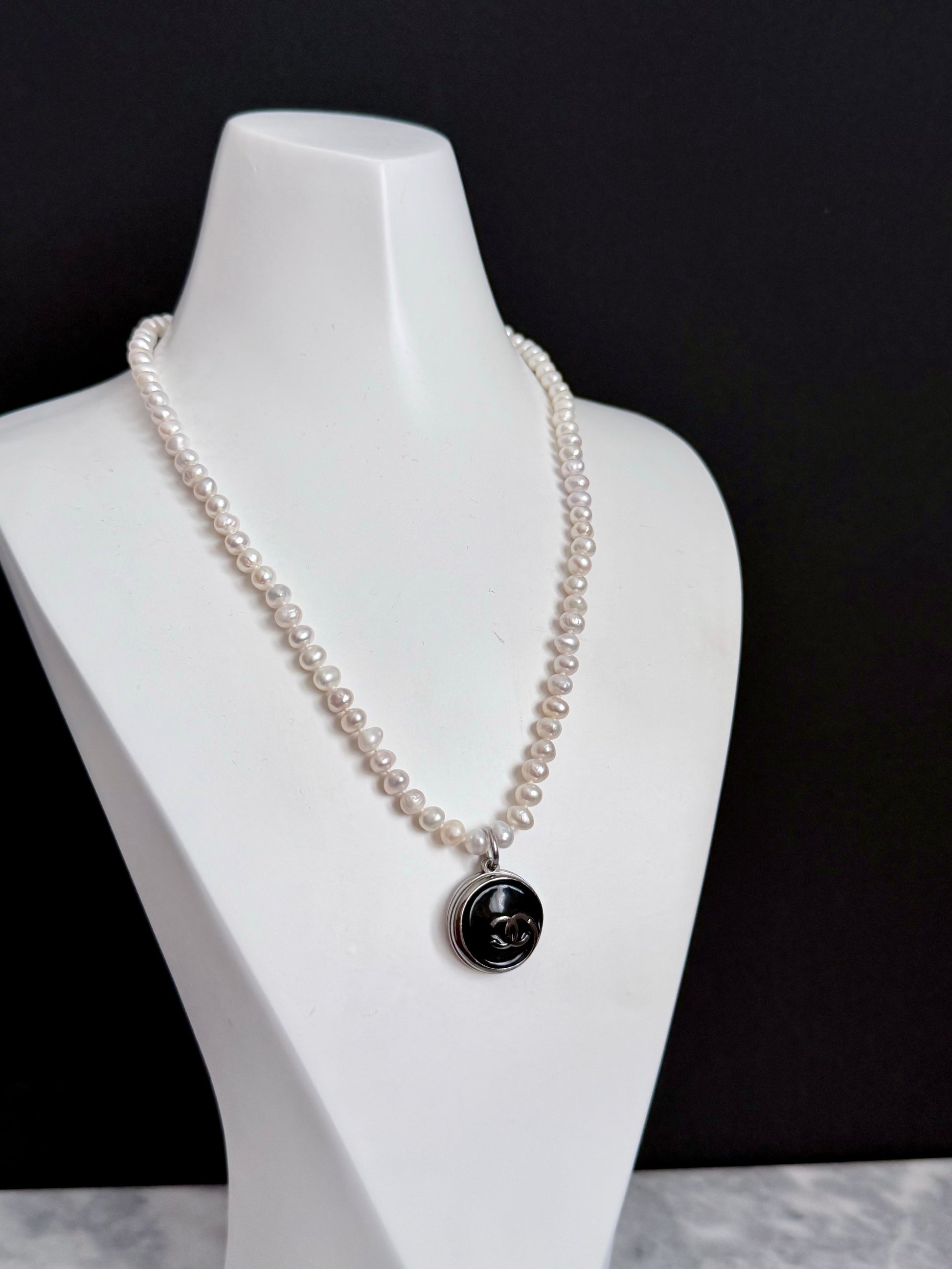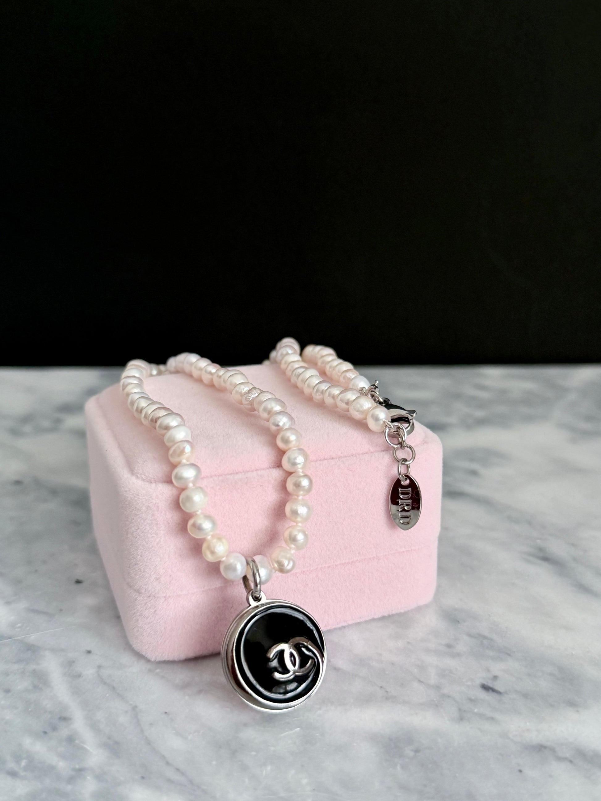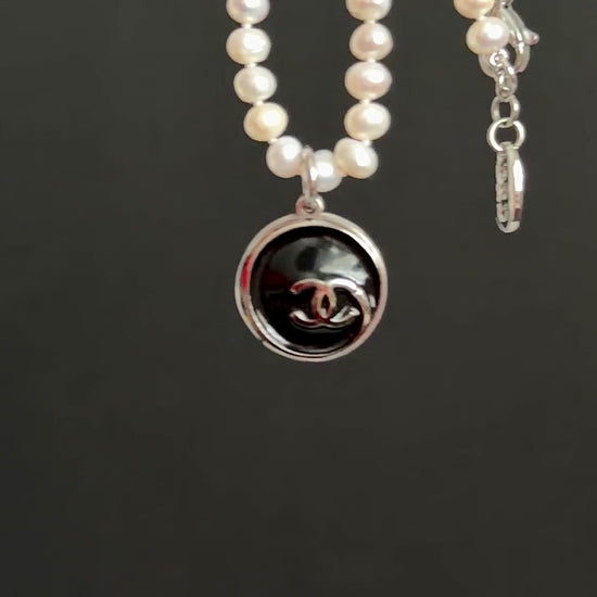 This magnificent pearl necklace is made using an Extremely Rare medium reworked C C button in black enamel design set onto a silver pendant, hanging from a delicate genuine designer pearl necklace.