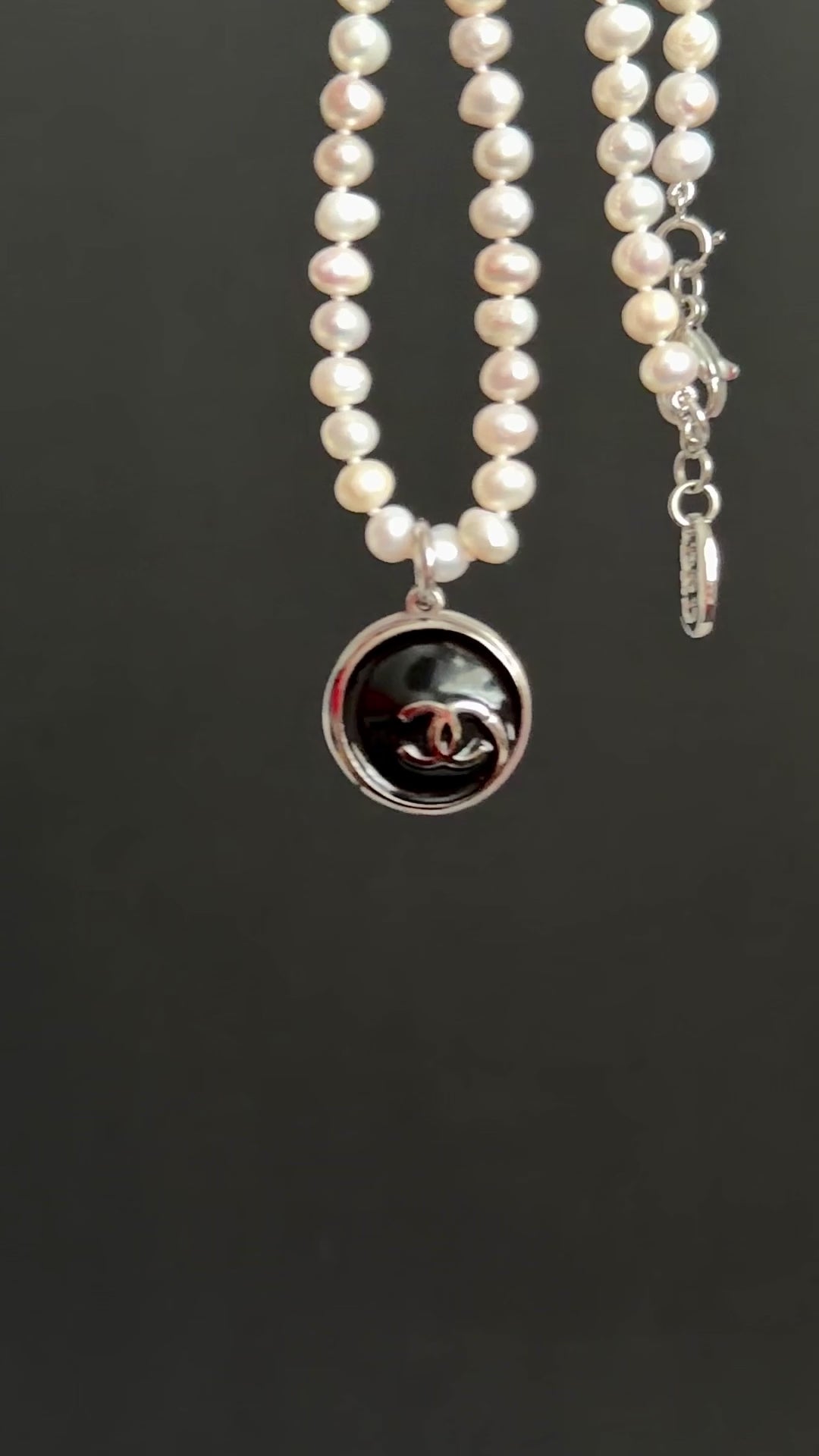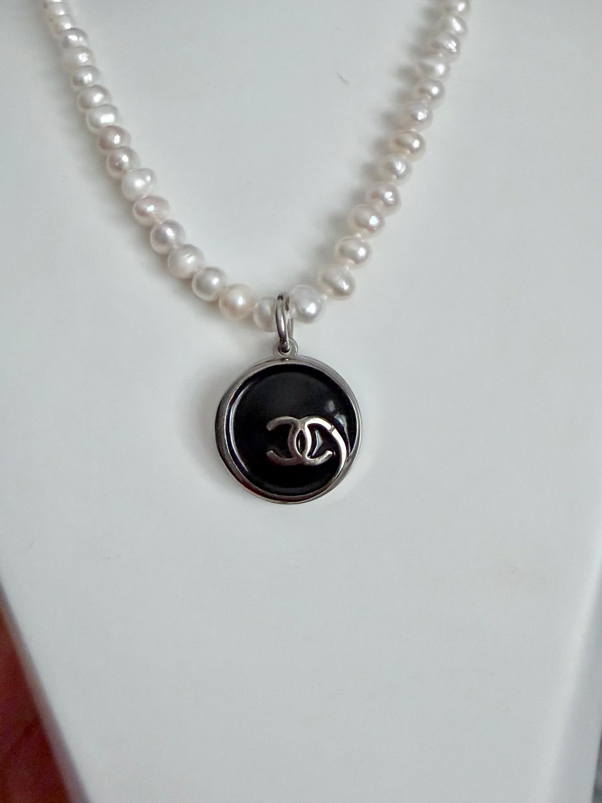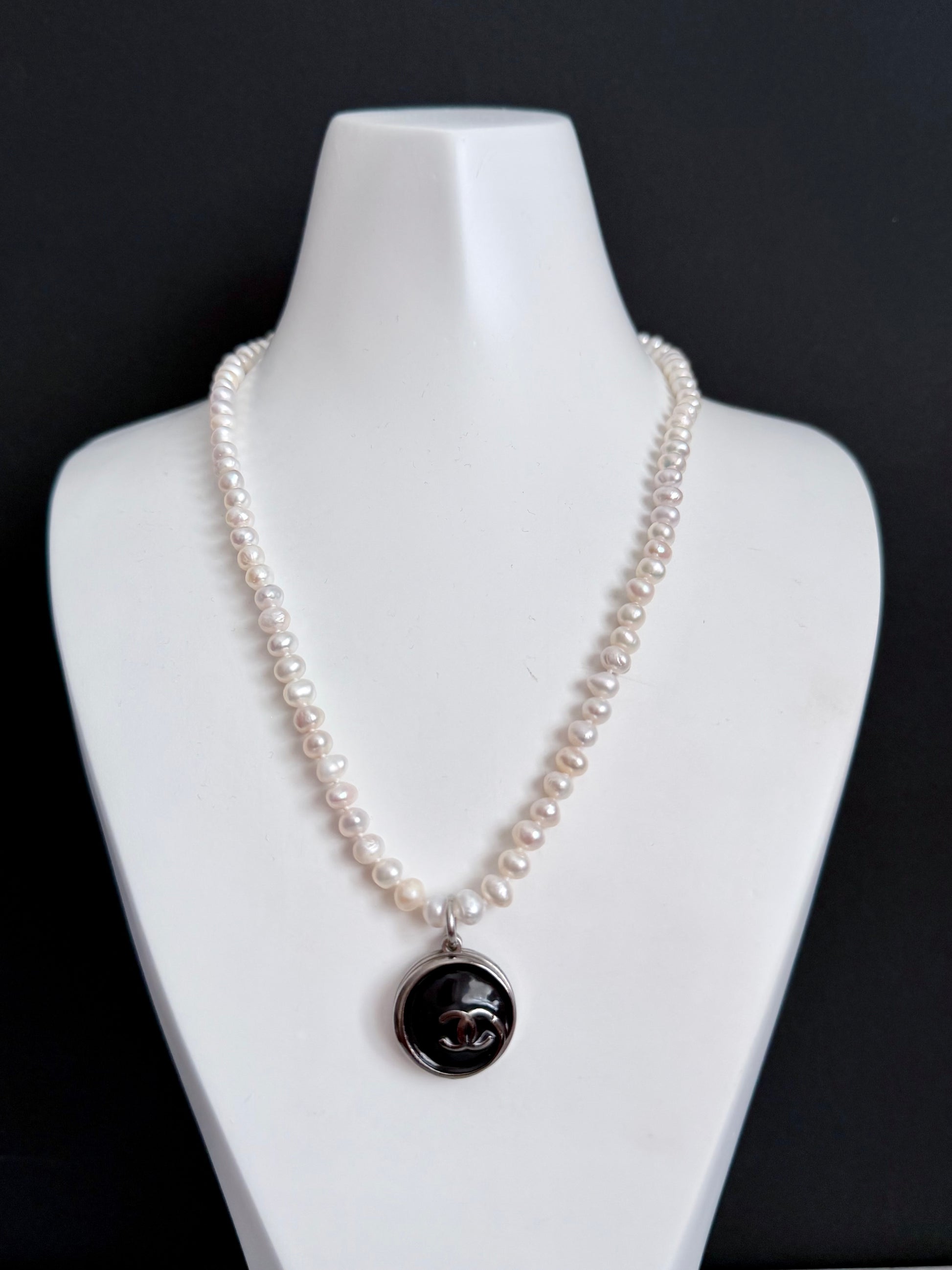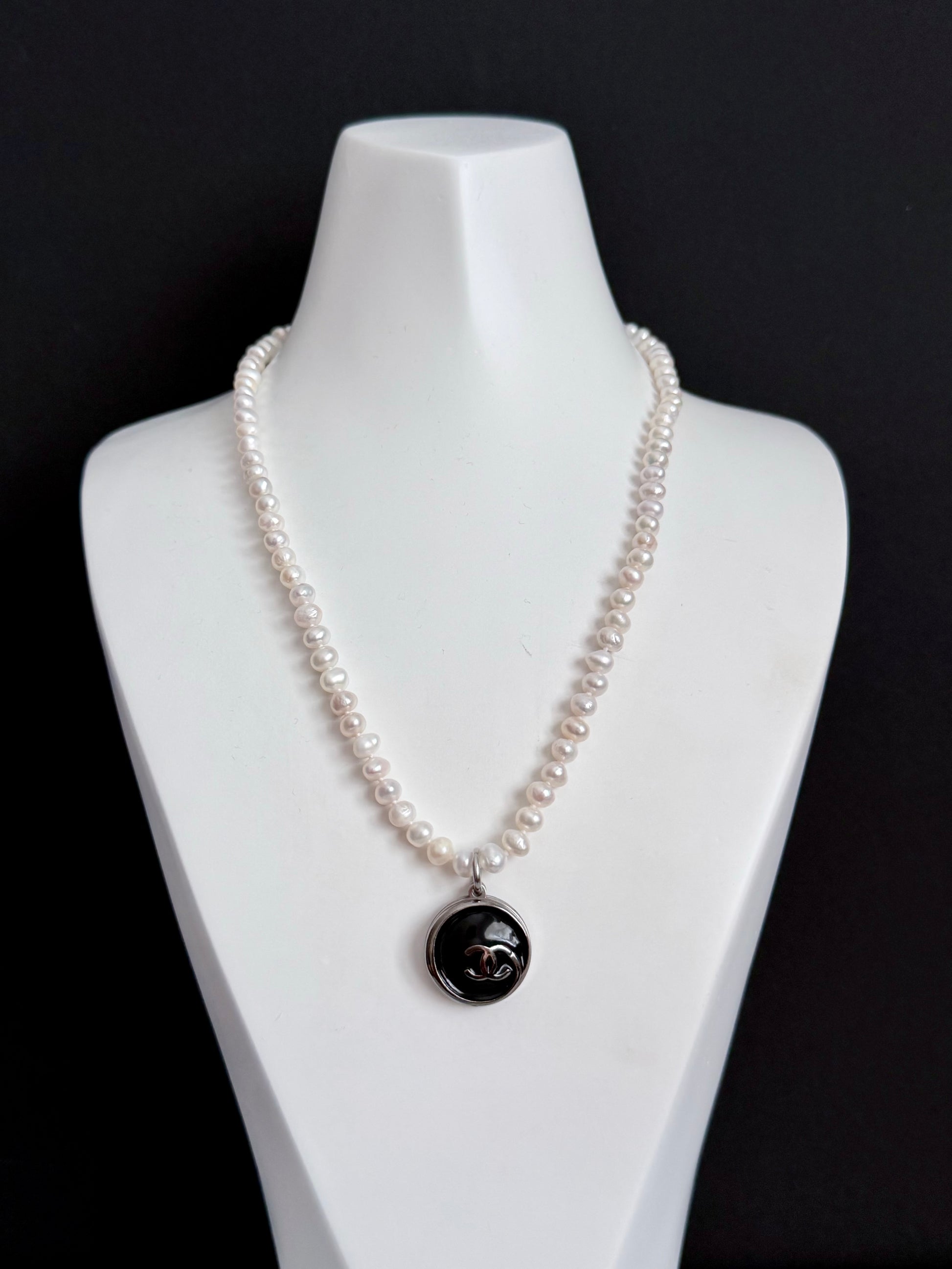This magnificent pearl necklace is made using an Extremely Rare medium reworked C C button in black enamel design set onto a silver pendant, hanging from a delicate genuine designer pearl necklace.