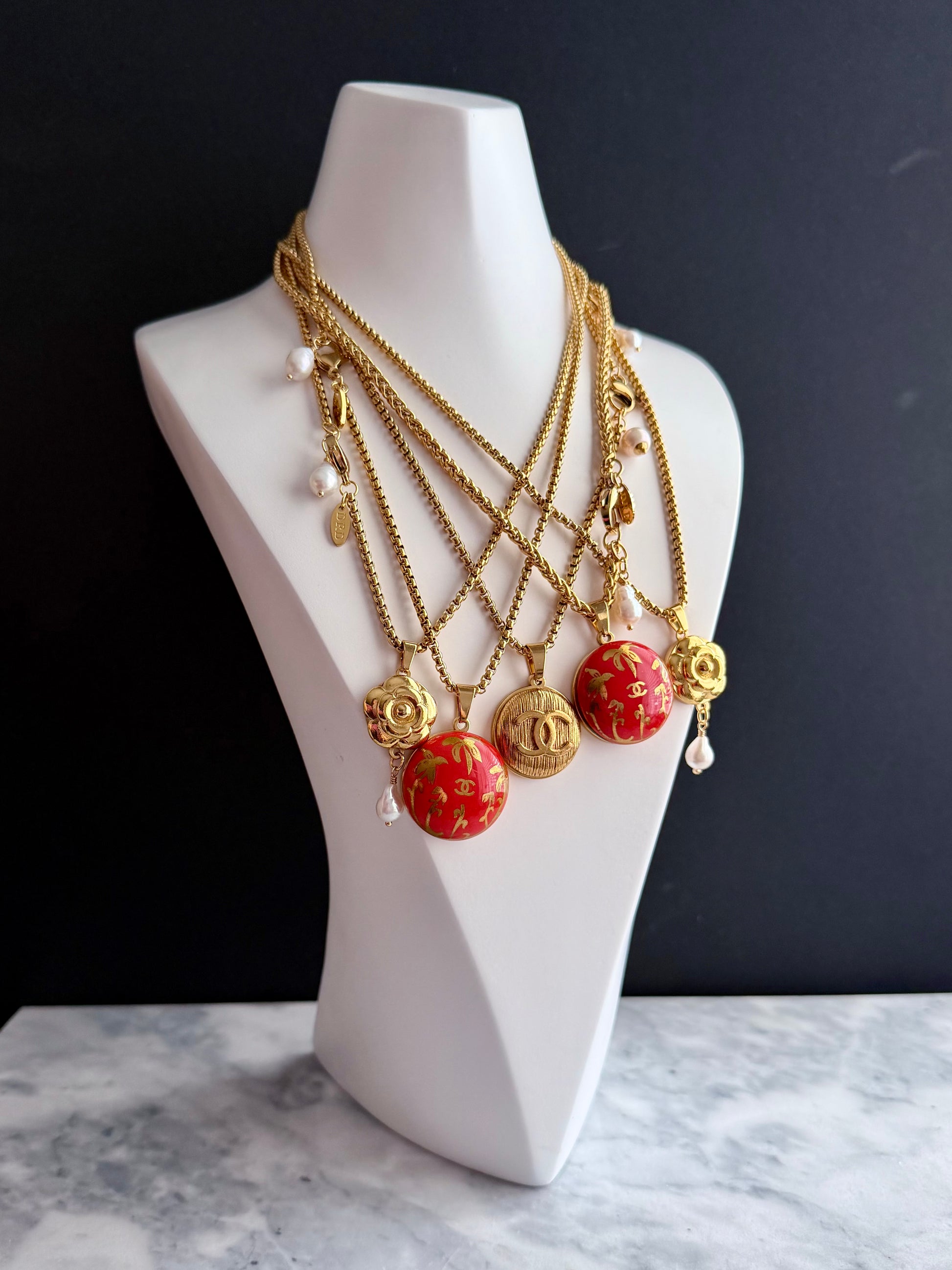 This gorgeous huge pendant necklace is made using an extremely rare Vintage reworked Authentic gold and orange C C button in a very large size in dome like 3D design, set onto a gold polished setting and hanging from a gorgeous gold intricate wheat chain, adorned with a genuine baroque tear pearl that can be worn front or back.