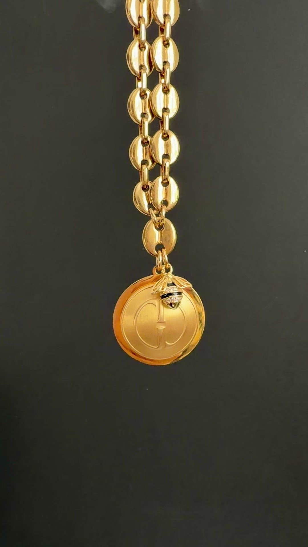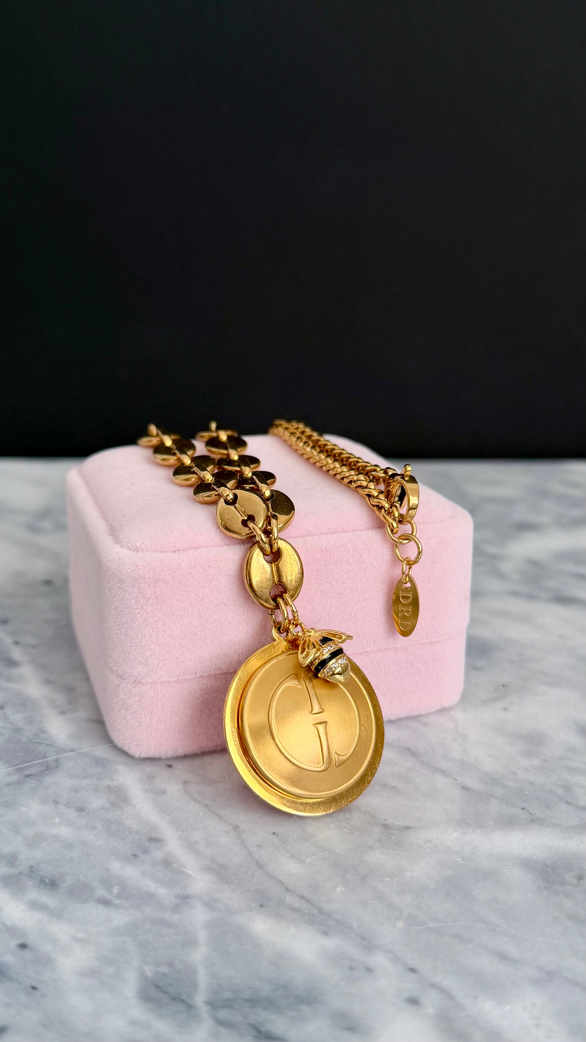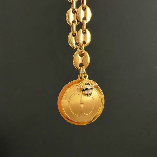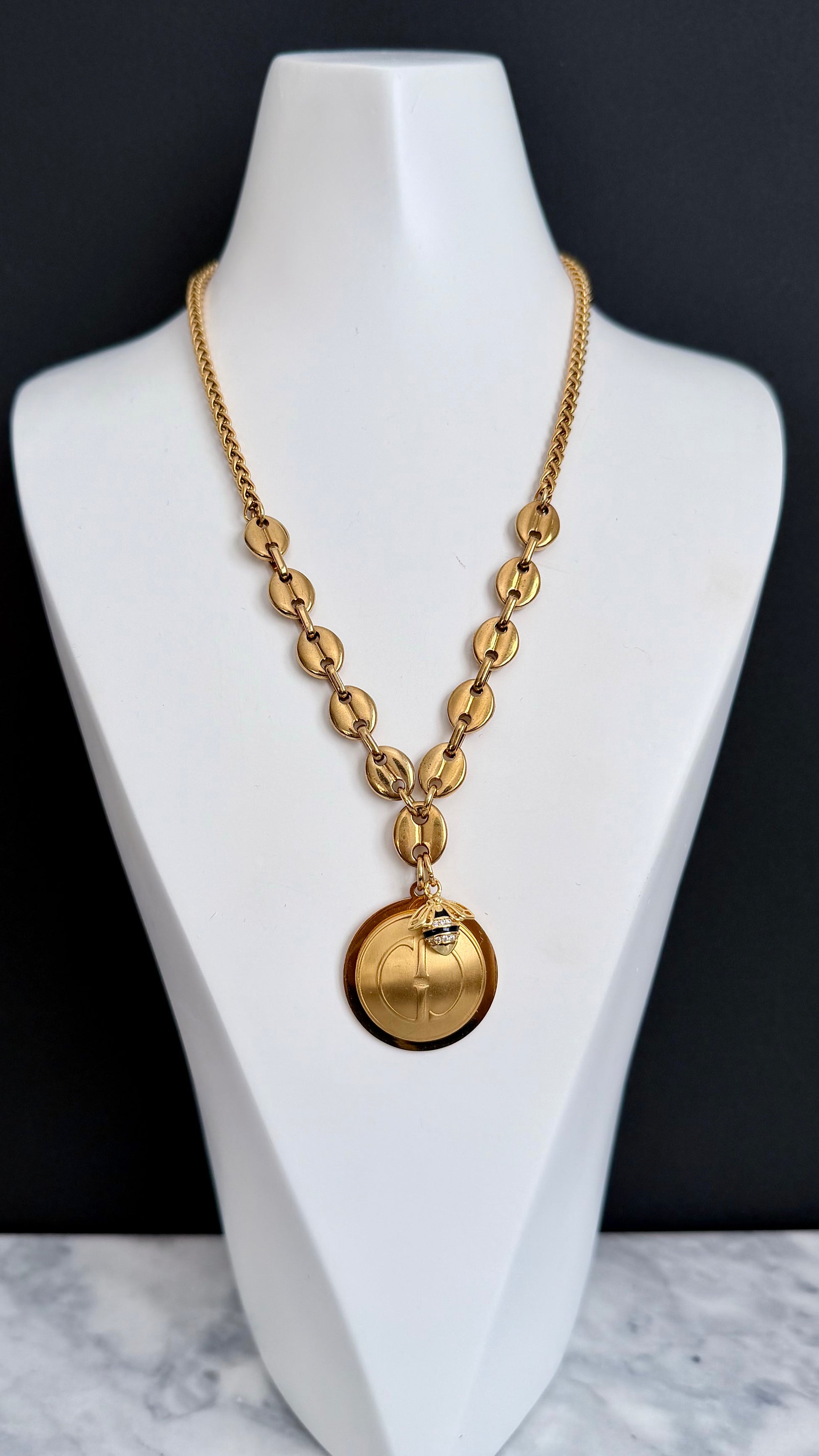 This large showstopper necklace is made using an extremely rare reworked Vintage GUCCI GG button in gold tone with vintage GG design set onto a halo mirrored pendant and hanging from a bean link chain. Adorned with a gorgeous enamelled bee charm.