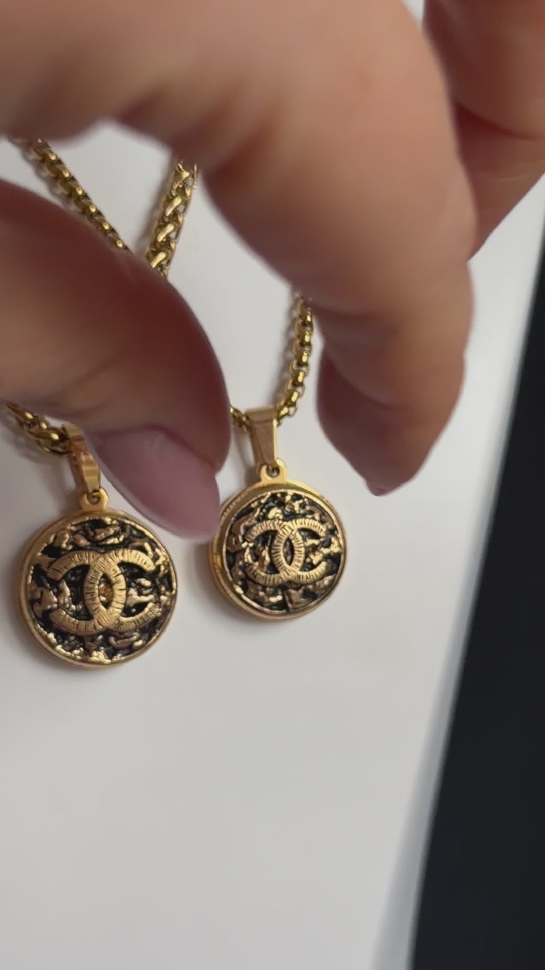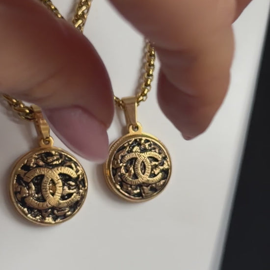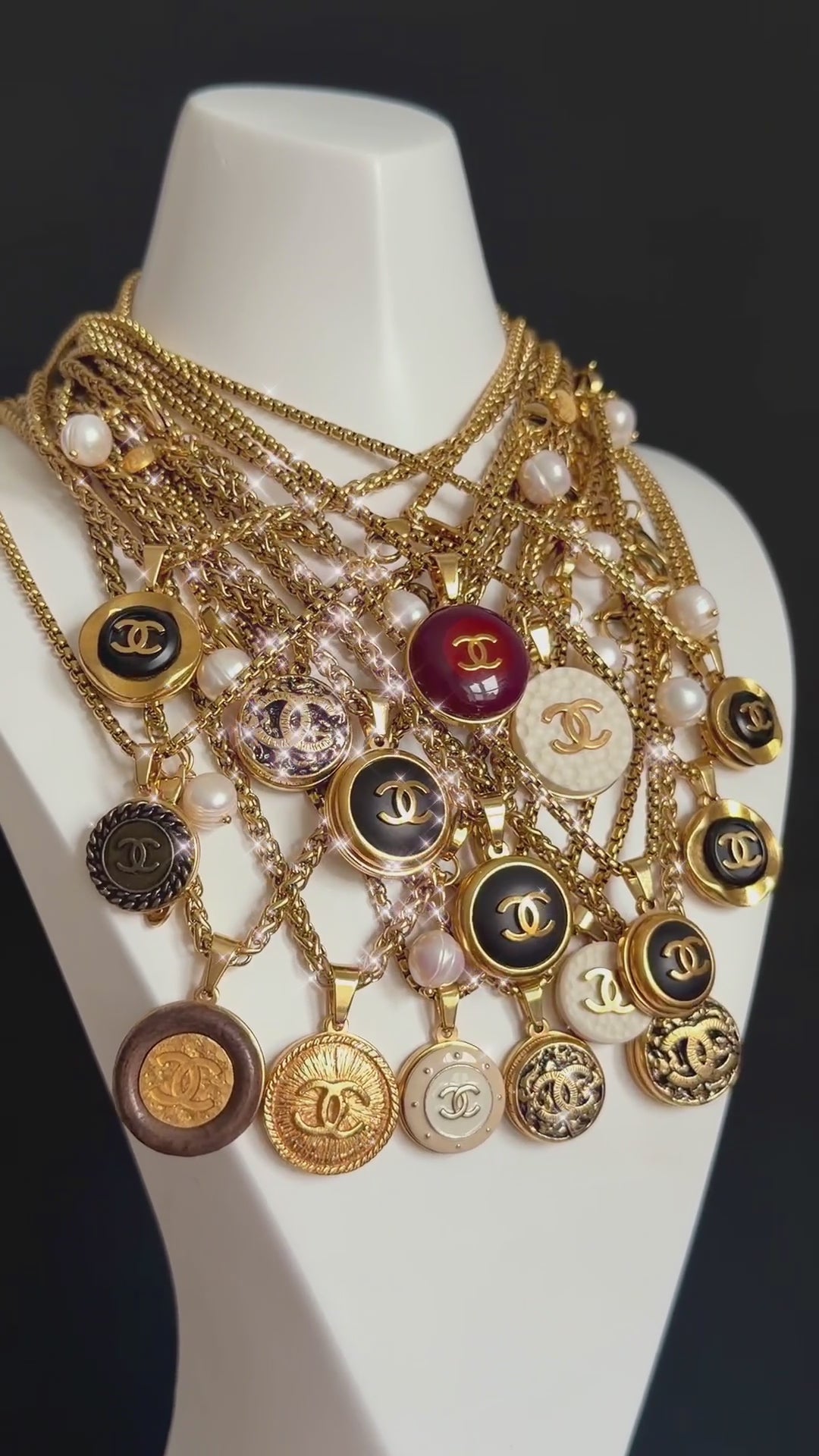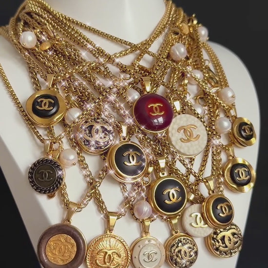 This gorgeous pendant necklace is made using an extremely rare Vintage reworked Authentic black and gold C C button in medium size in dome like 3D design, set onto a gold polished setting and hanging from a gorgeous gold round box chain, adorned with a genuine baroque pearl that can be worn front or back.