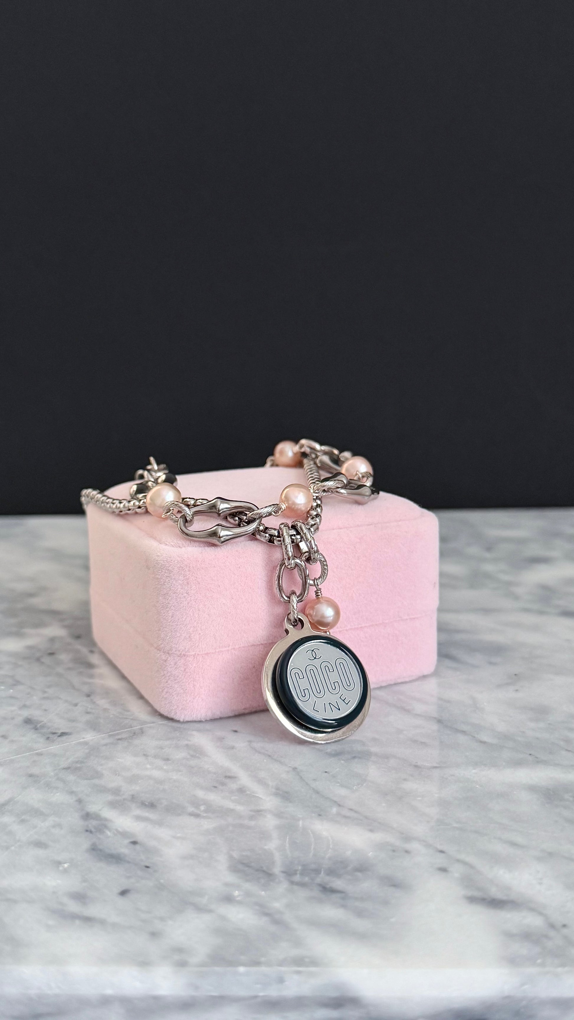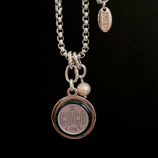 It is made using an extremely rare modern reworked plastic mirrored C C button in Large size set onto a mirror polished setting and hanging from a dual design chain.