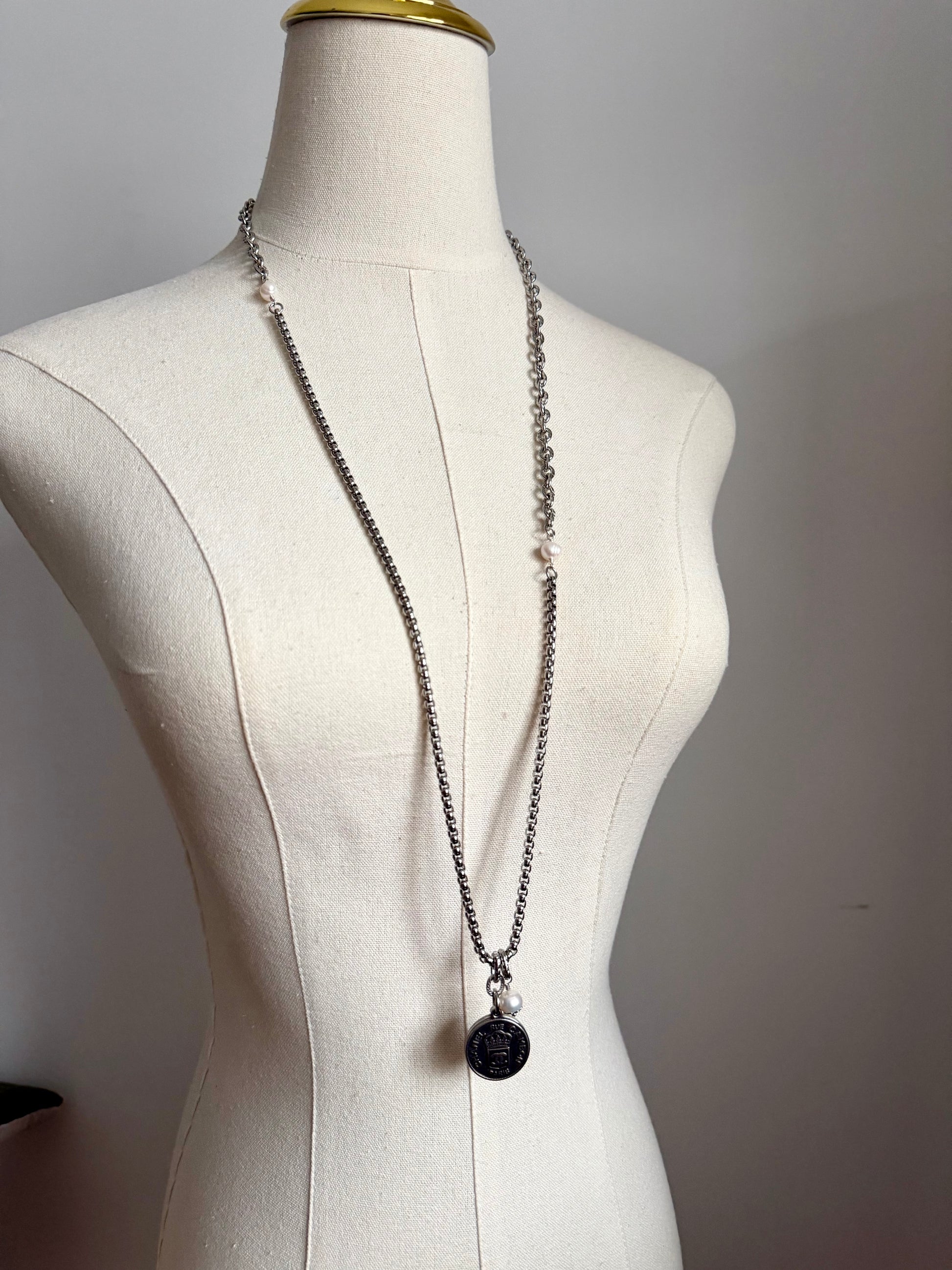 This gorgeous long necklace is made using a rare reworked antique silver pendant in antique silver crown design in large size set onto a mirrored setting hanging from a long dual design chain. Adorned with genuine baroque pearls and can be worn doubled up for a casual trendy look. Super gorgeous and universal piece that can be dressed up or down!