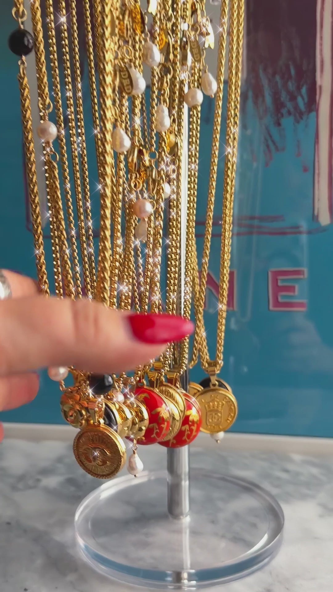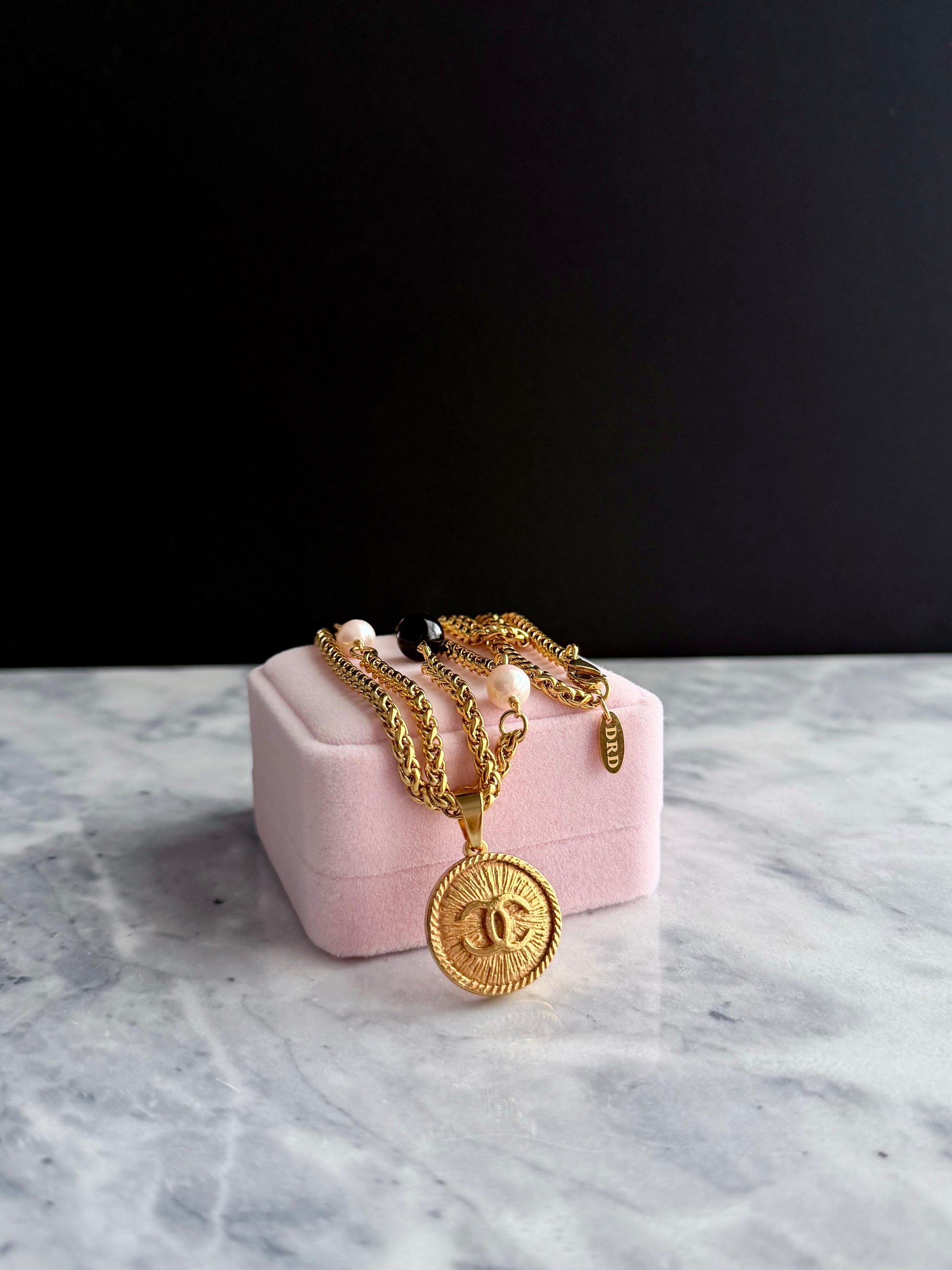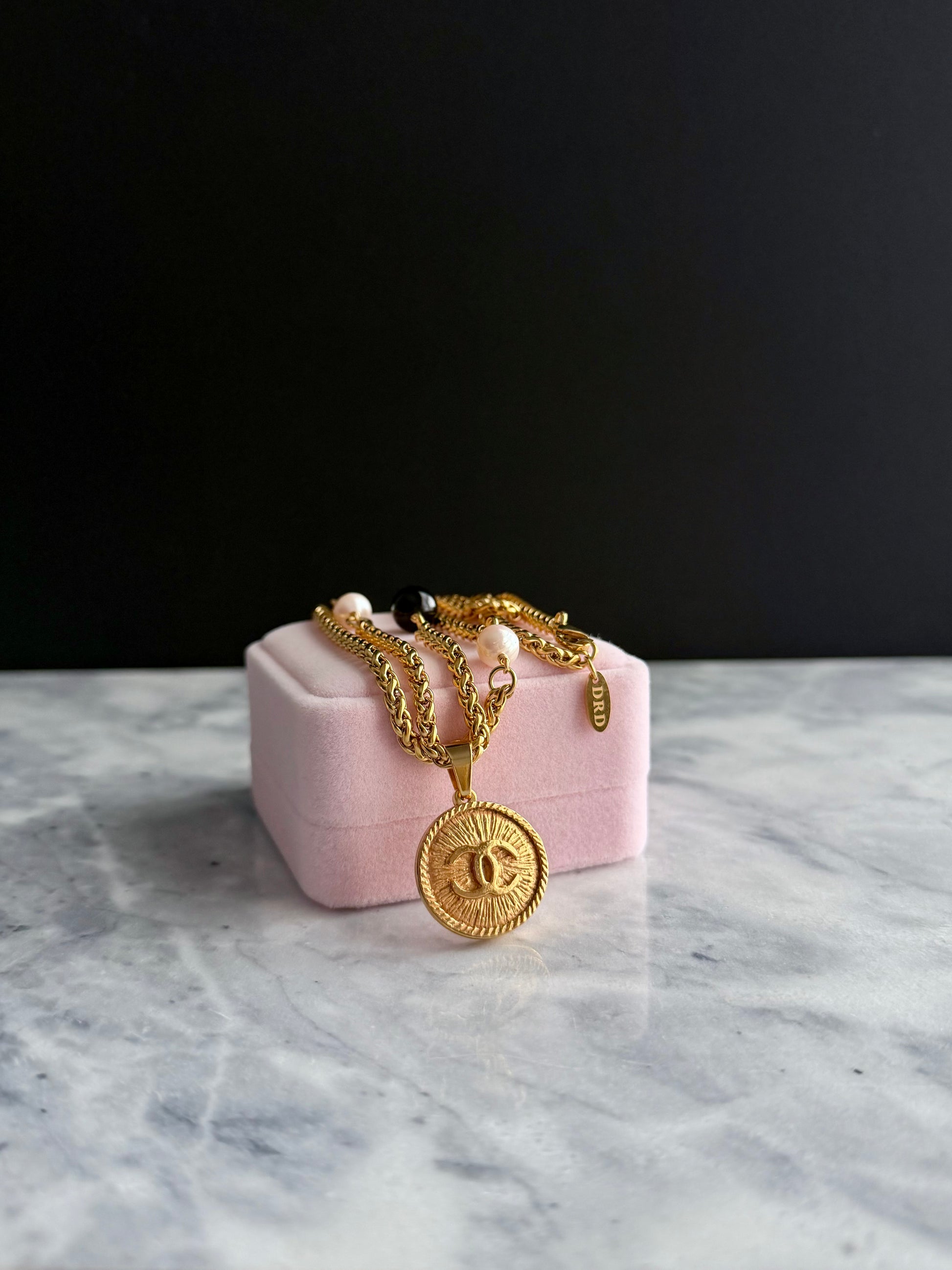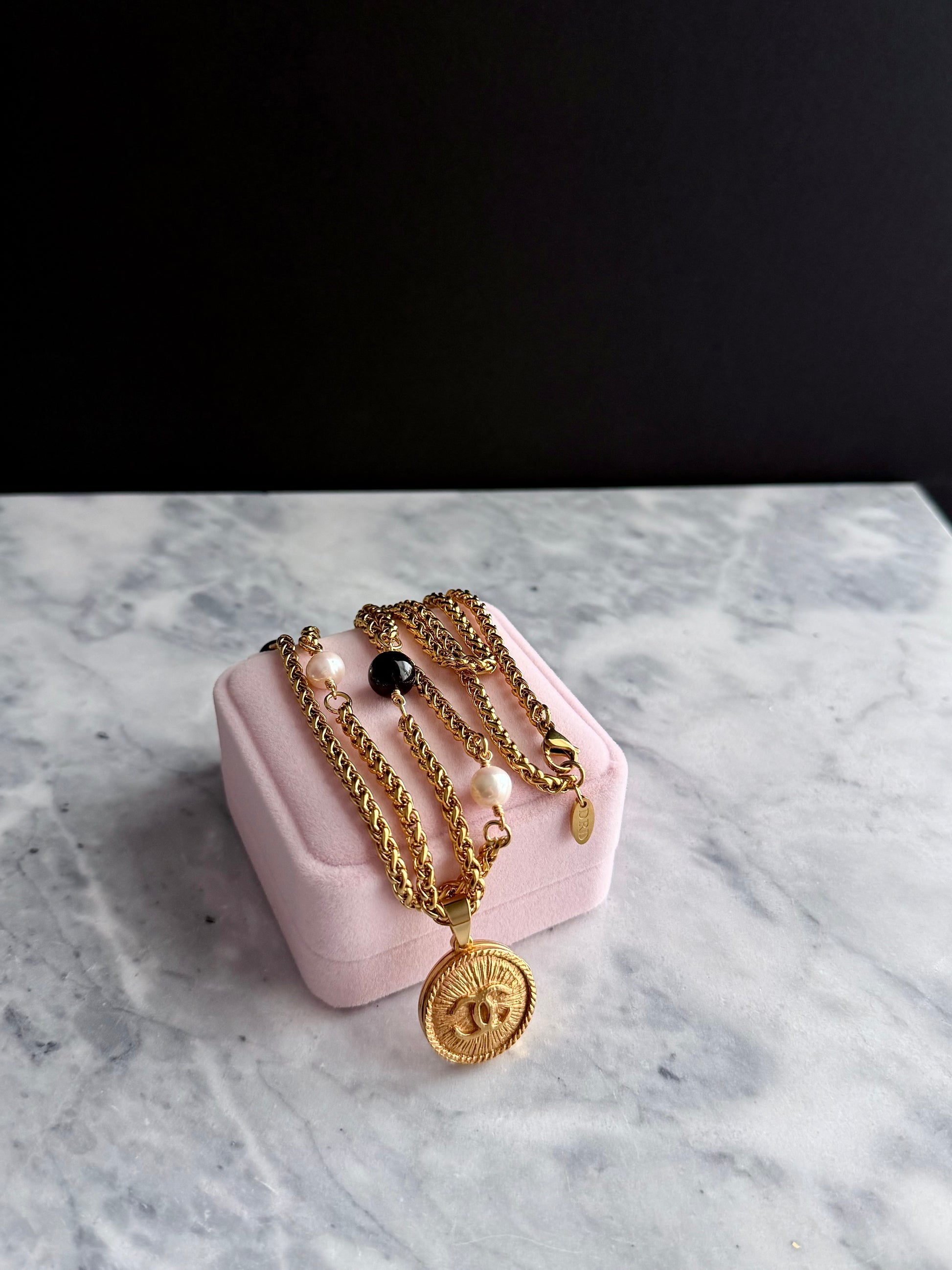 This magnificent long necklace is made using an extremely rare reworked VINTAGE Authentic C C button in large size, set onto a mirror polished setting and hanging from a chunky wheat chain and beautiful genuine pearls and onyx beads.
