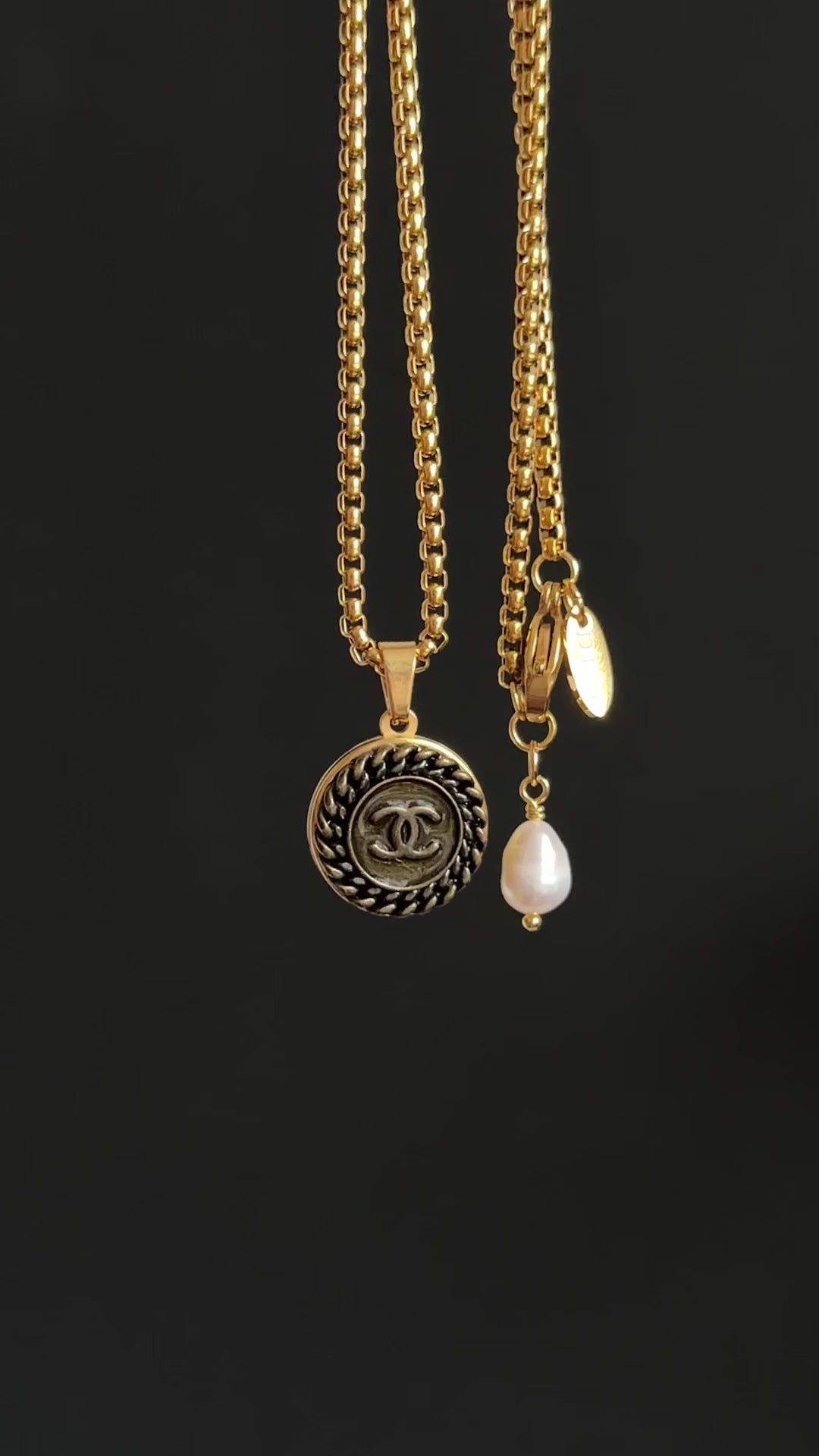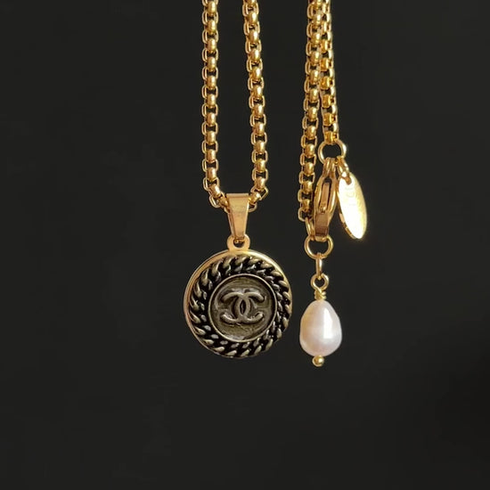 This gorgeous pendant necklace is made using an extremely rare reworked Authentic enamelled gold C C button in medium size in intricate design, set onto a gold polished setting and hanging from a gorgeous gold round box chain, adorned with a genuine baroque pearl that can be worn front or back.