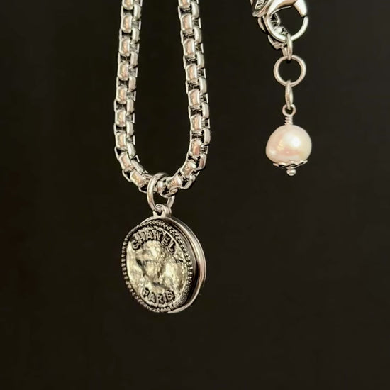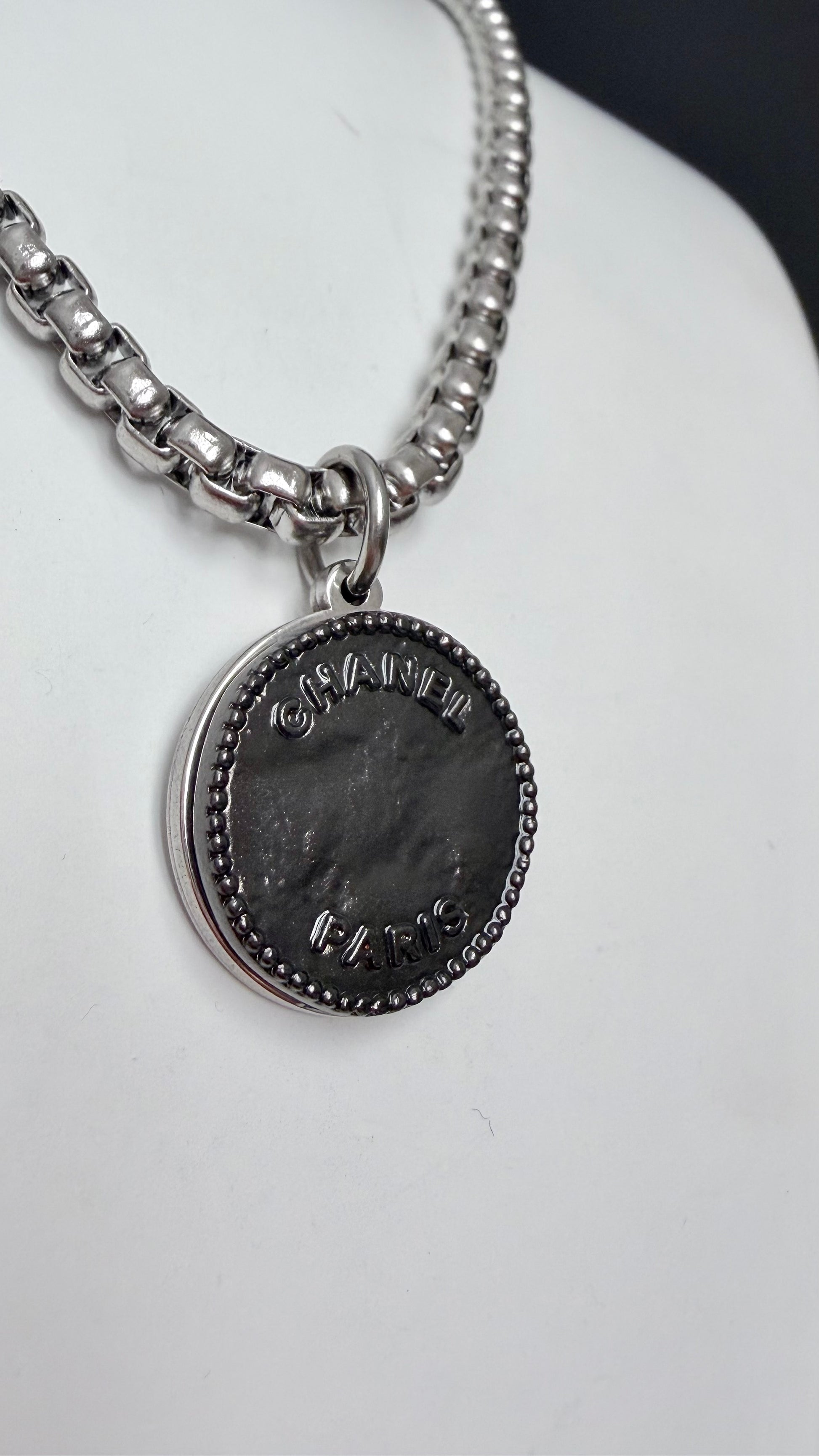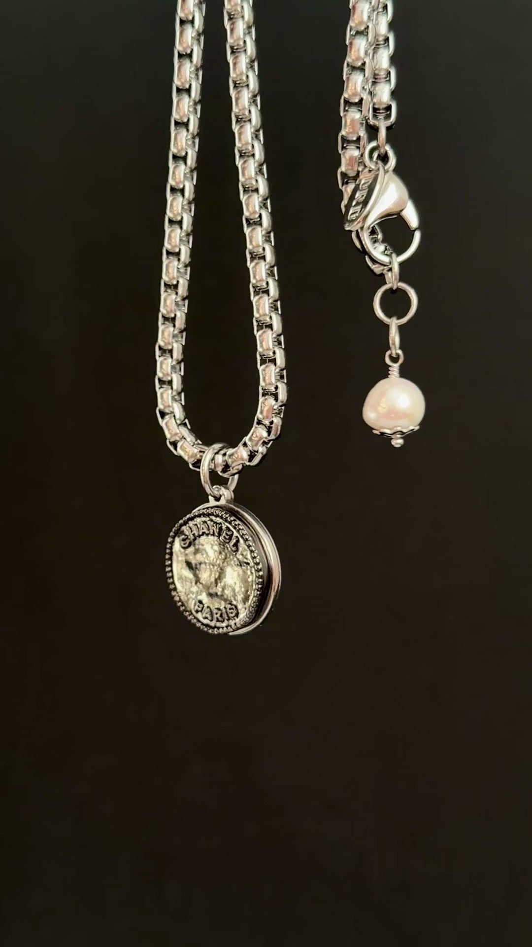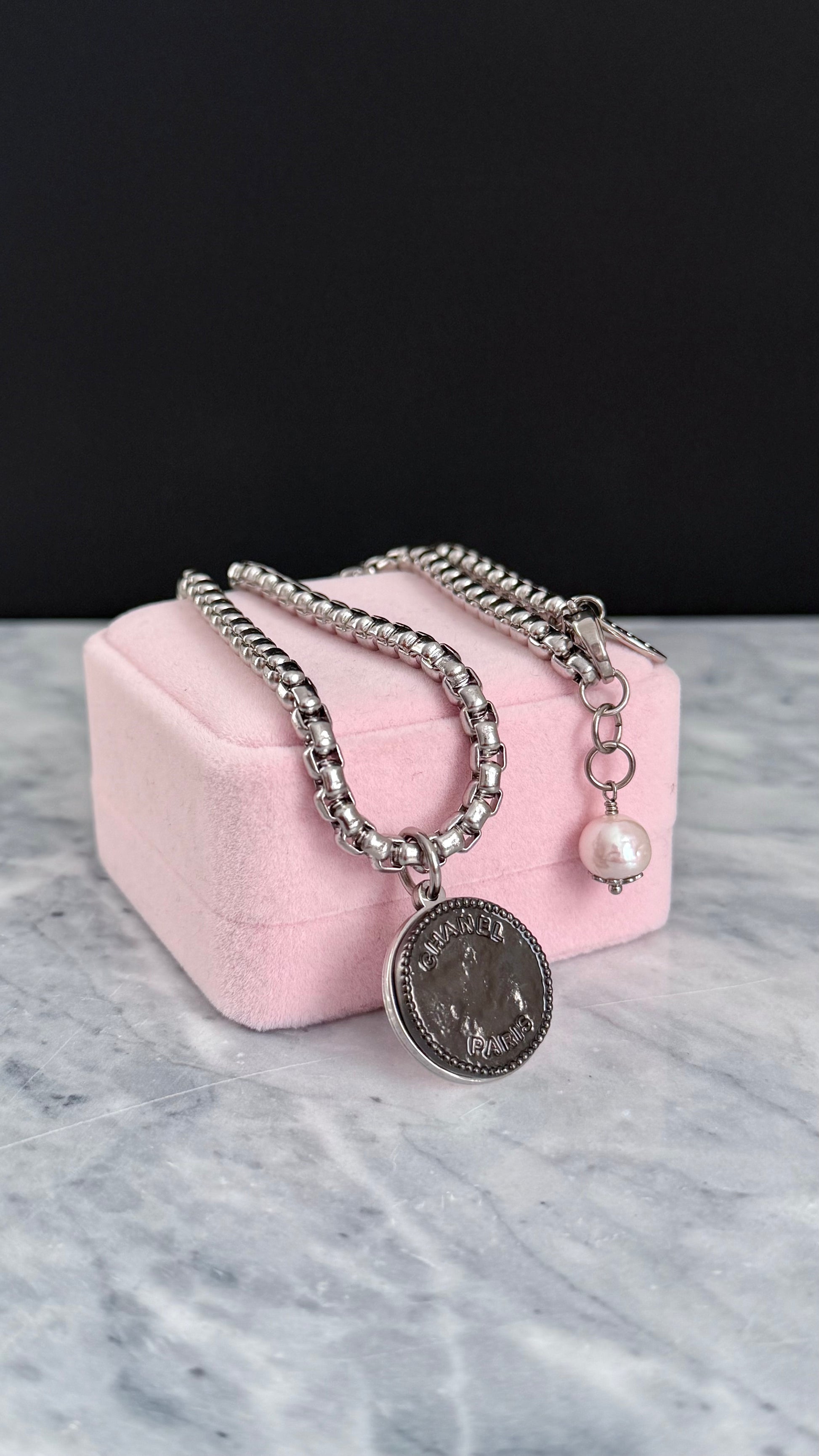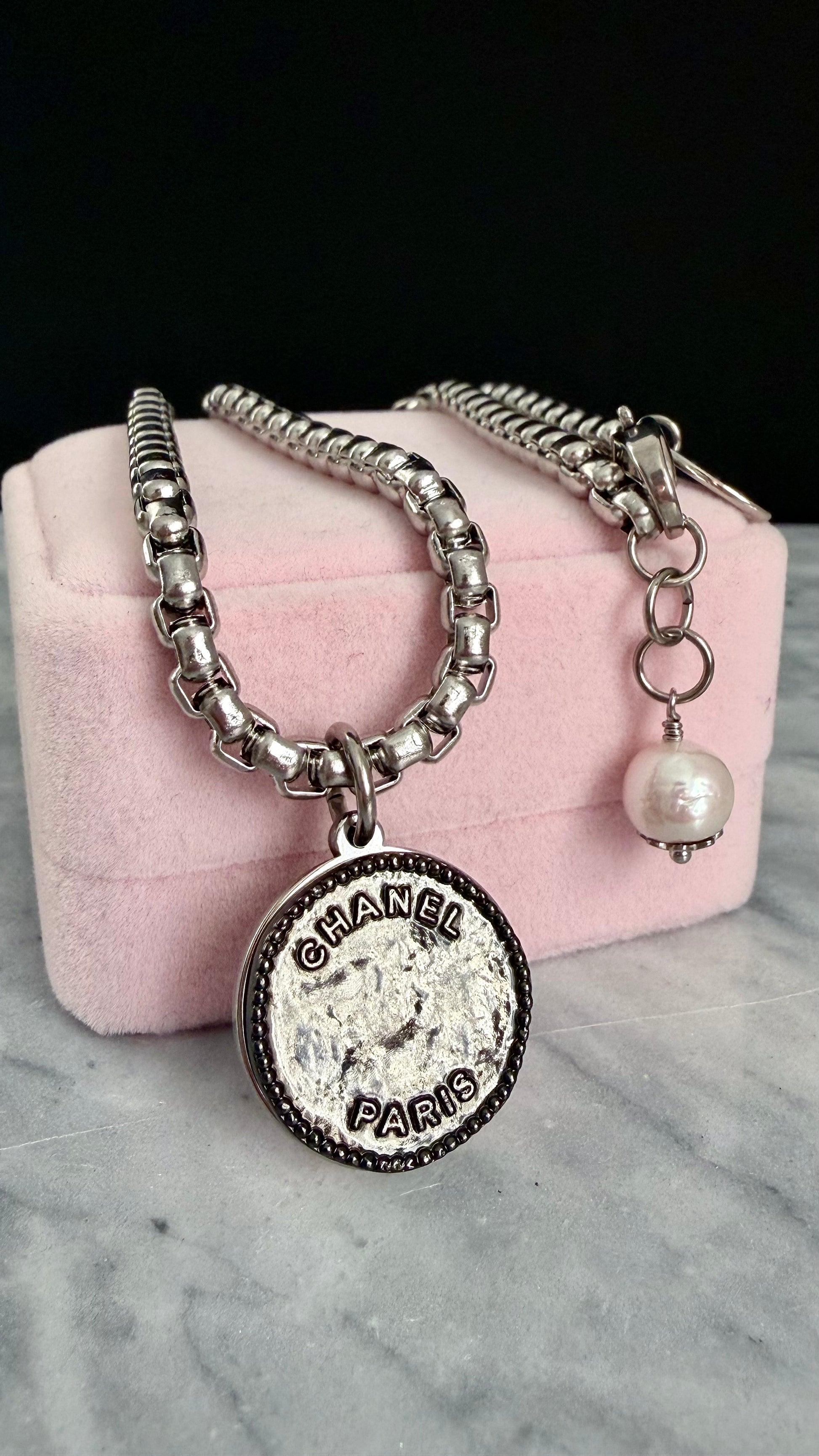 It is made using an extremely rare reworked modern shiny gunmetal button in Large size set onto a mirrored setting and hanging from a gorgeous chunky round box chain. Adorned with a genuine baroque pearls