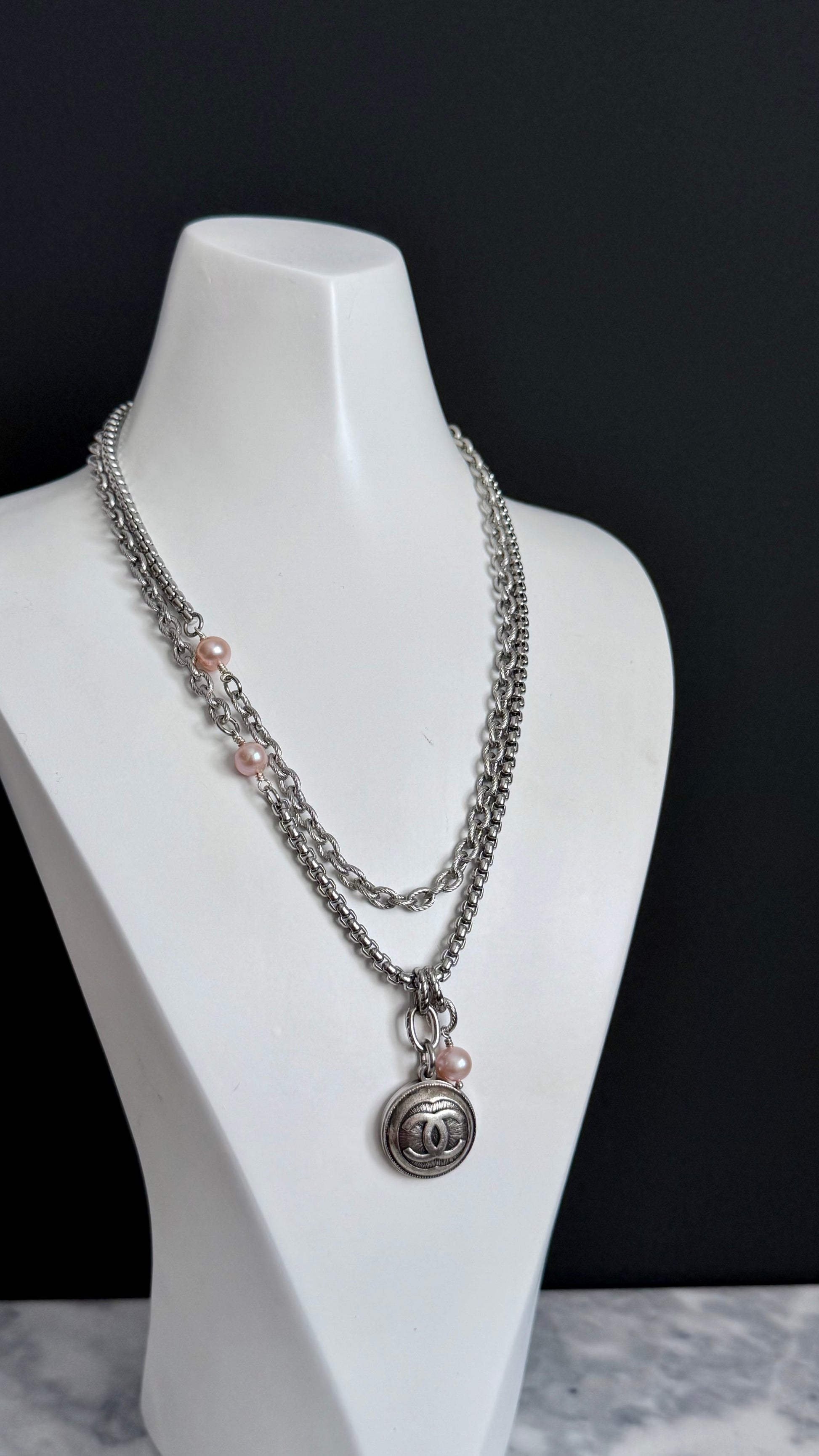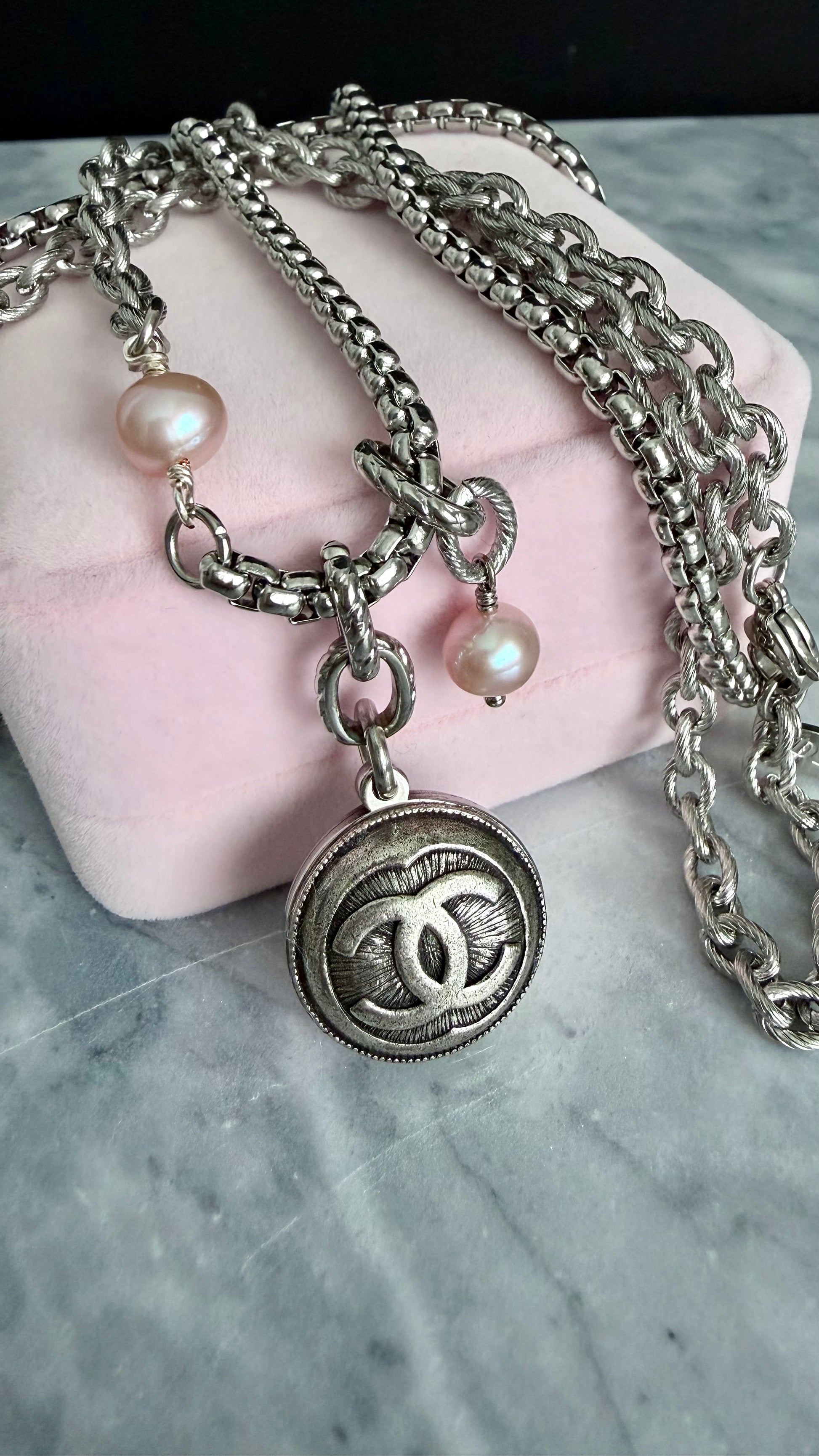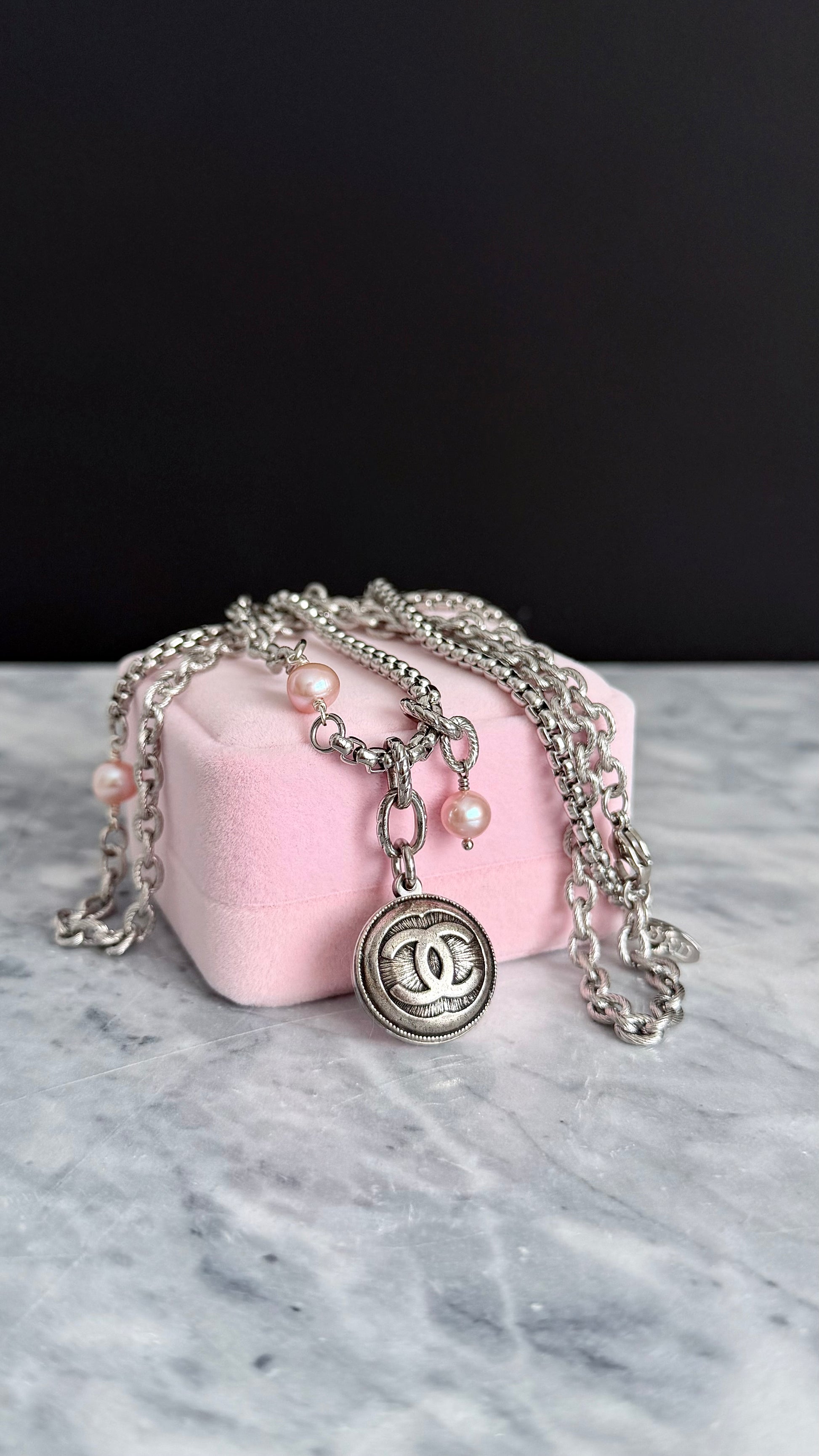 This gorgeous long necklace is made using a rare reworked Vintage C C button in antique silver design set onto a silver setting hanging from a long dual design chain. Adorned with delicate genuine pearls in baby pink hues and can be worn doubled up for a casual trendy look. Super gorgeous and universal piece that can be dressed up or down!