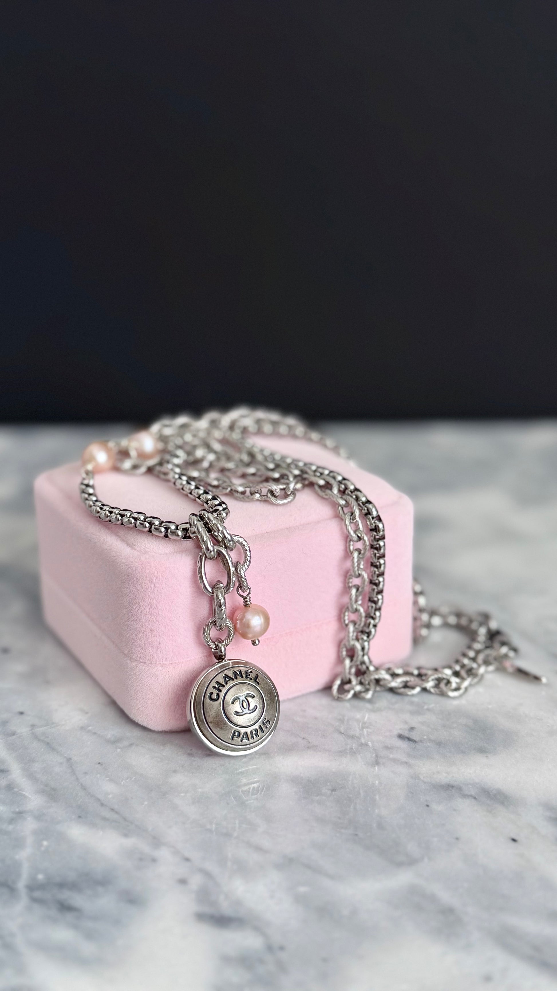 This gorgeous long necklace is made using a rare reworked Vintage C C button in antique silver design set onto a silver setting hanging from a long dual design chain. Adorned with delicate genuine pearls in baby pink hues and can be worn doubled up for a casual trendy look. Super gorgeous and universal piece that can be dressed up or down!
