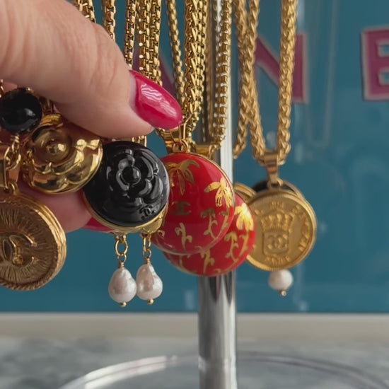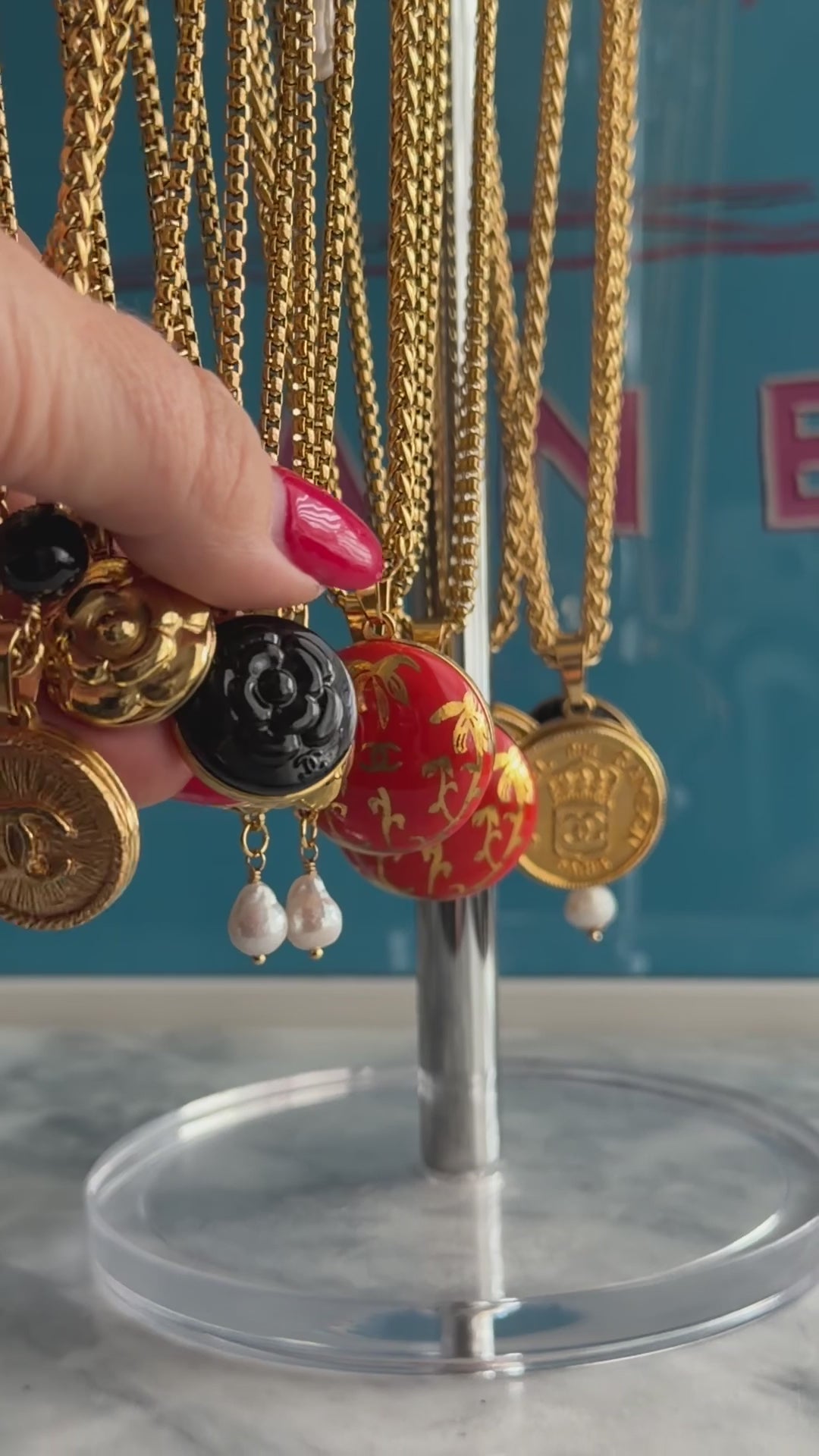 This STUNNING One of a Kind necklace is made using a rare reworked black plastic C C button in large size, set onto a gold polished setting and hanging from a gorgeous round box chain. adorned with a huge baroque pearl.